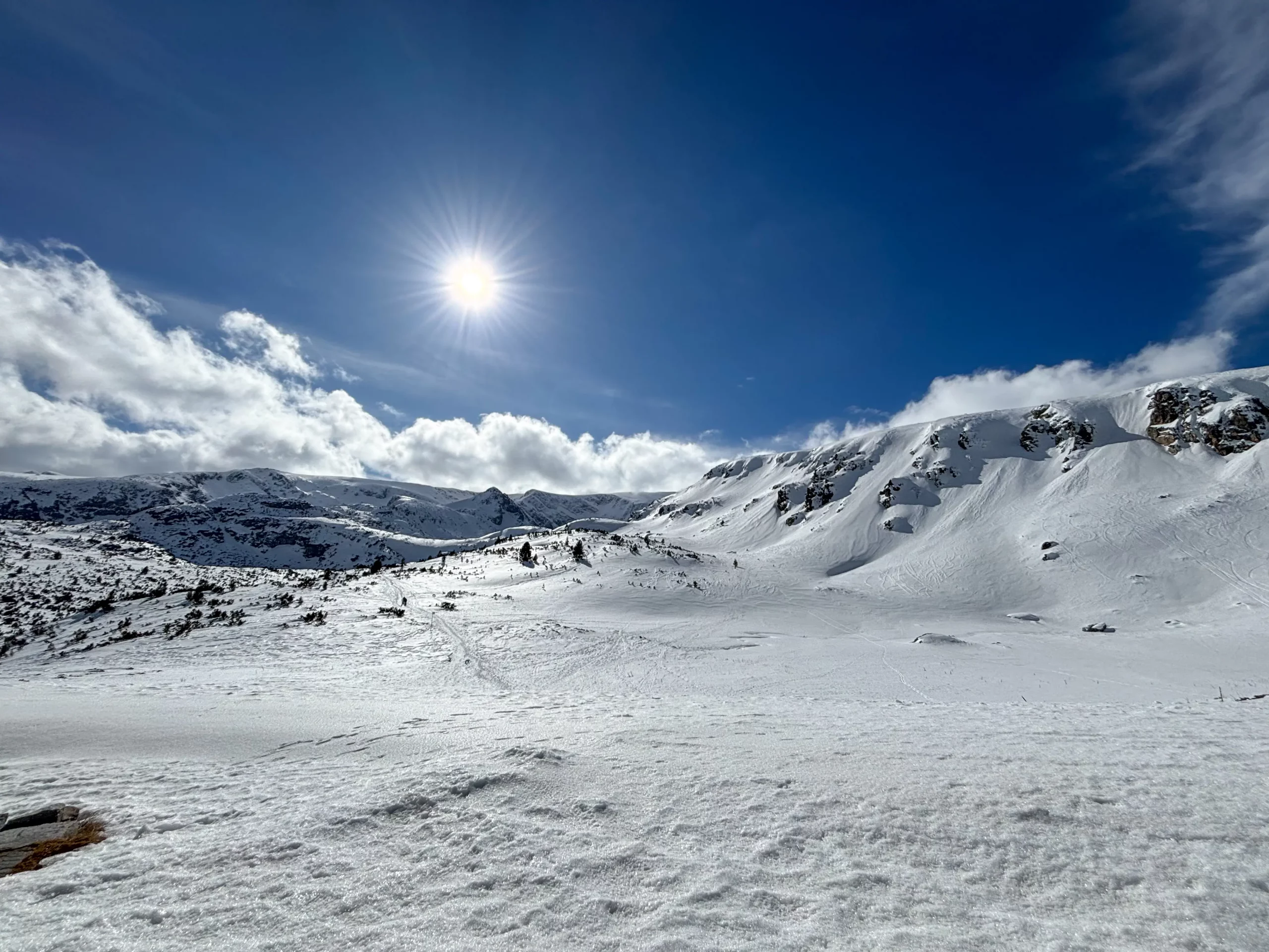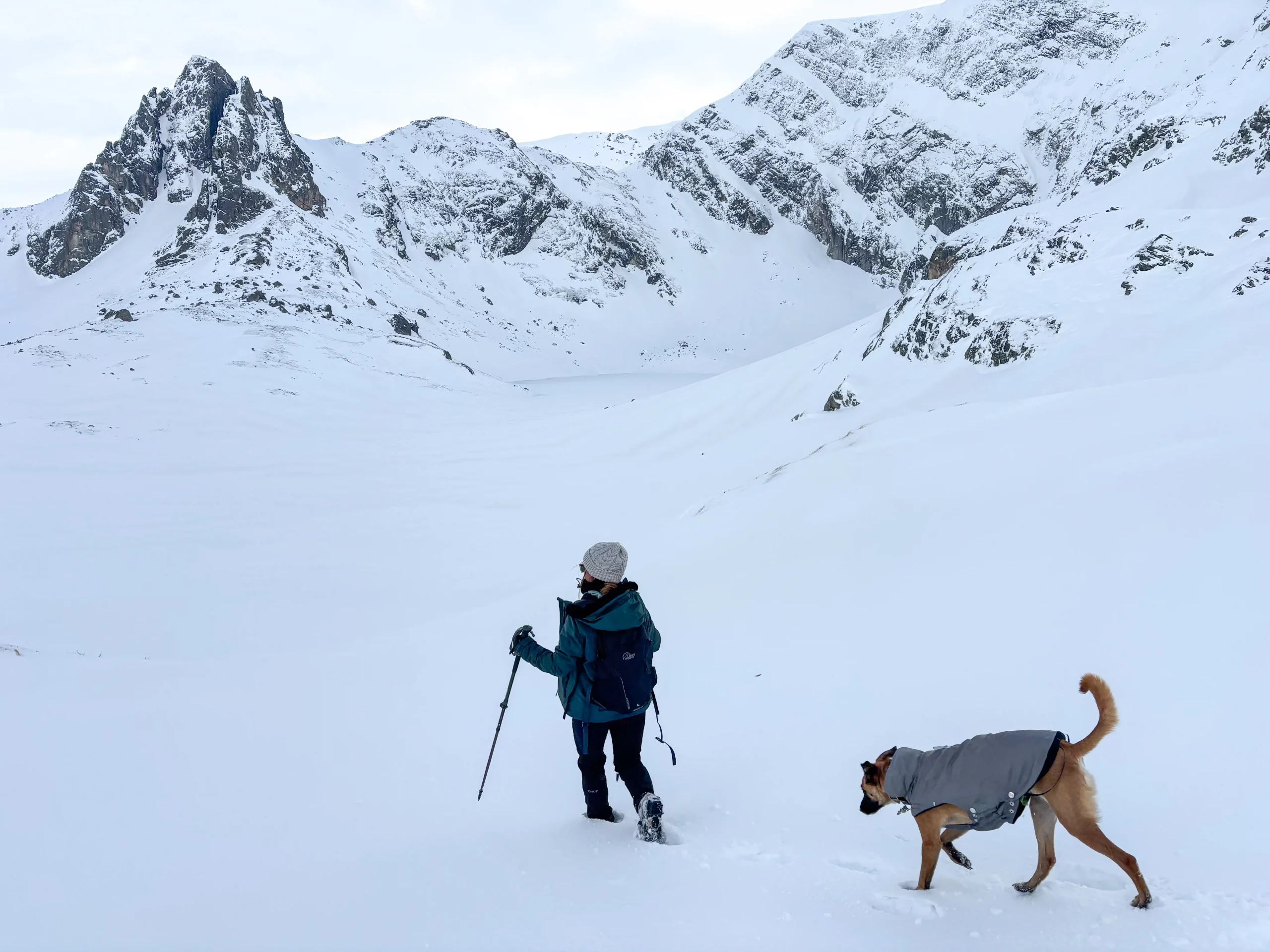 Malgré la neige qui recouvrait les lacs, la randonnée était époustouflante. Bien sûr, certains passages étaient vraiment difficiles, avec des endroits où nos jambes s’enfonçaient dans la poudreuse jusqu’aux genoux. À ce moment-là, des raquettes auraient bien été utiles, mais ça faisait aussi partie du charme de l’aventure, de se retrouver dans cette ambiance presque irréelle. Le paysage était à couper le souffle : des forêts enneigées, des pistes de ski désertes, et une tranquillité totale. C’était comme si on était seuls au monde, perdus dans un tableau de neige et de montagnes. On n’a croisé que quelques personnes, genre 4-5 surfeurs et quelques chiens en balade autour du télésiège. C’était presque comme si on avait ce coin de paradis rien que pour nous.
