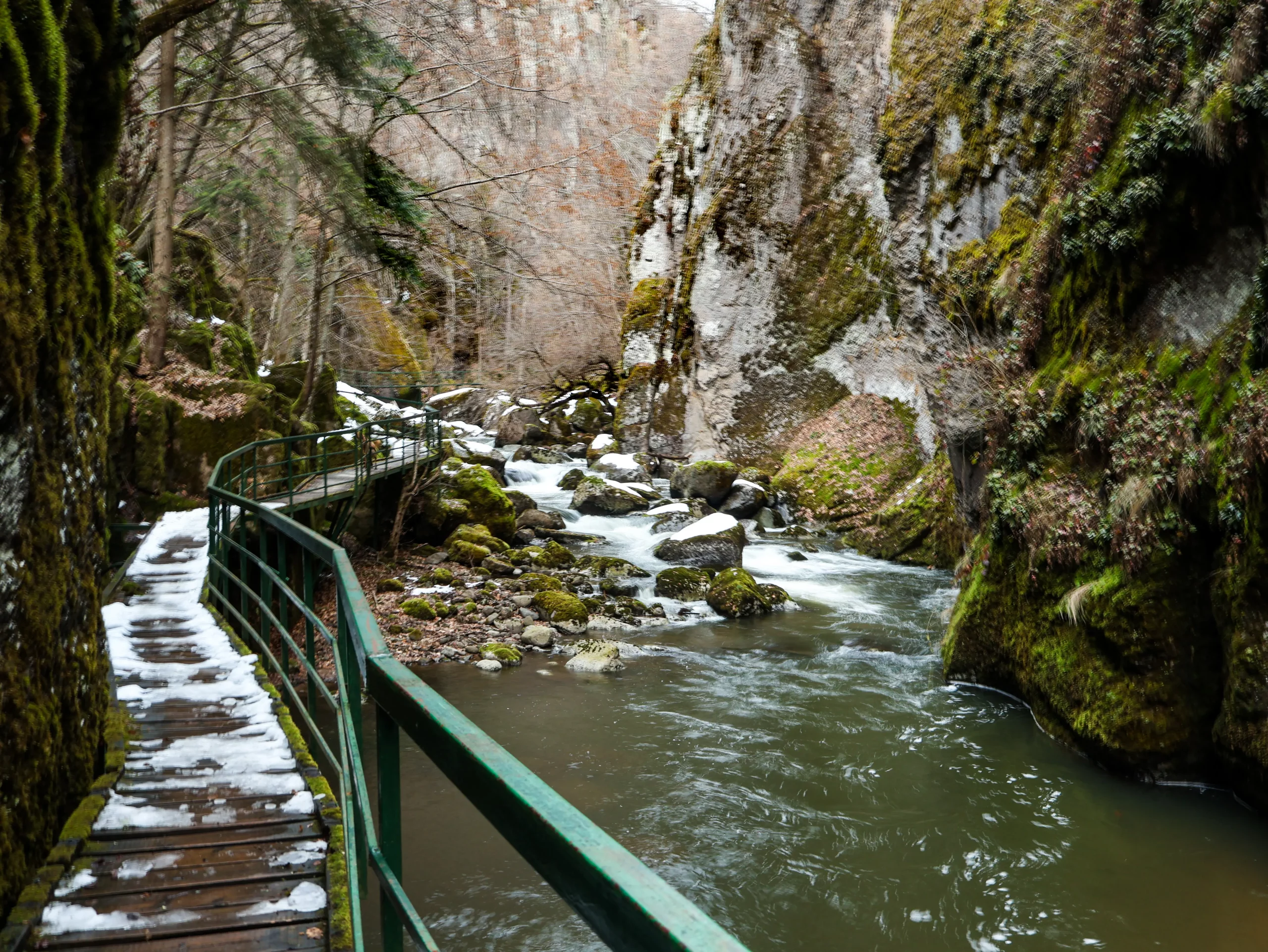 La gorge se resserre à la fin du chemin, et une passerelle permet de traverser la rivière pour prendre un autre sentier pour le retour. Nous avions prévu de faire la boucle complète de la randonnée en passant par ce chemin, mais la neige et la végétation trop dense nous en empêchent. Pas de souci, on se contente de faire demi-tour et de reprendre le même parcours.