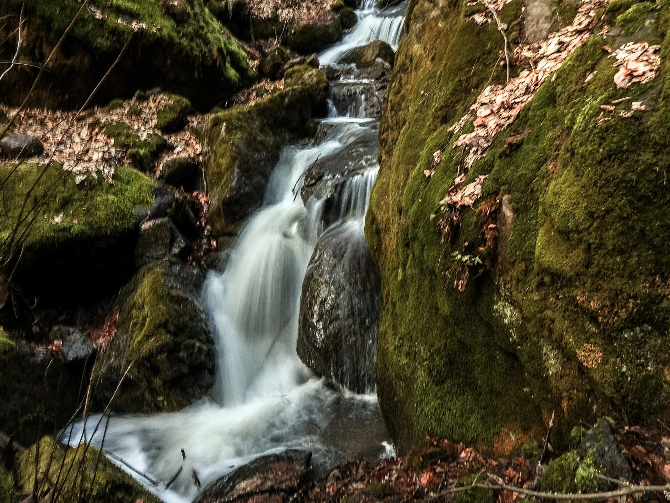 La randonnée commence sur un grand chemin facile, et on arrive vite à un carrefour. À droite, il y a un pont et deux chemins : l’un part à gauche du pont, l’autre à droite. On choisit le chemin de droite, histoire d’aller voir une première chute d’eau. Ça monte tout doucement, et après quelques minutes, on atteint une jolie petite cascade, bien cachée dans la végétation.