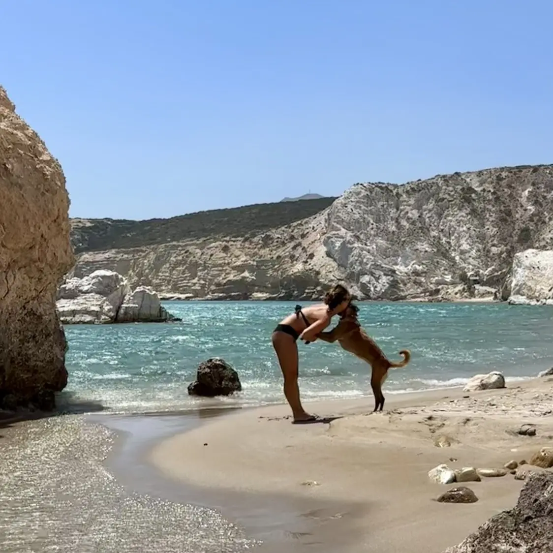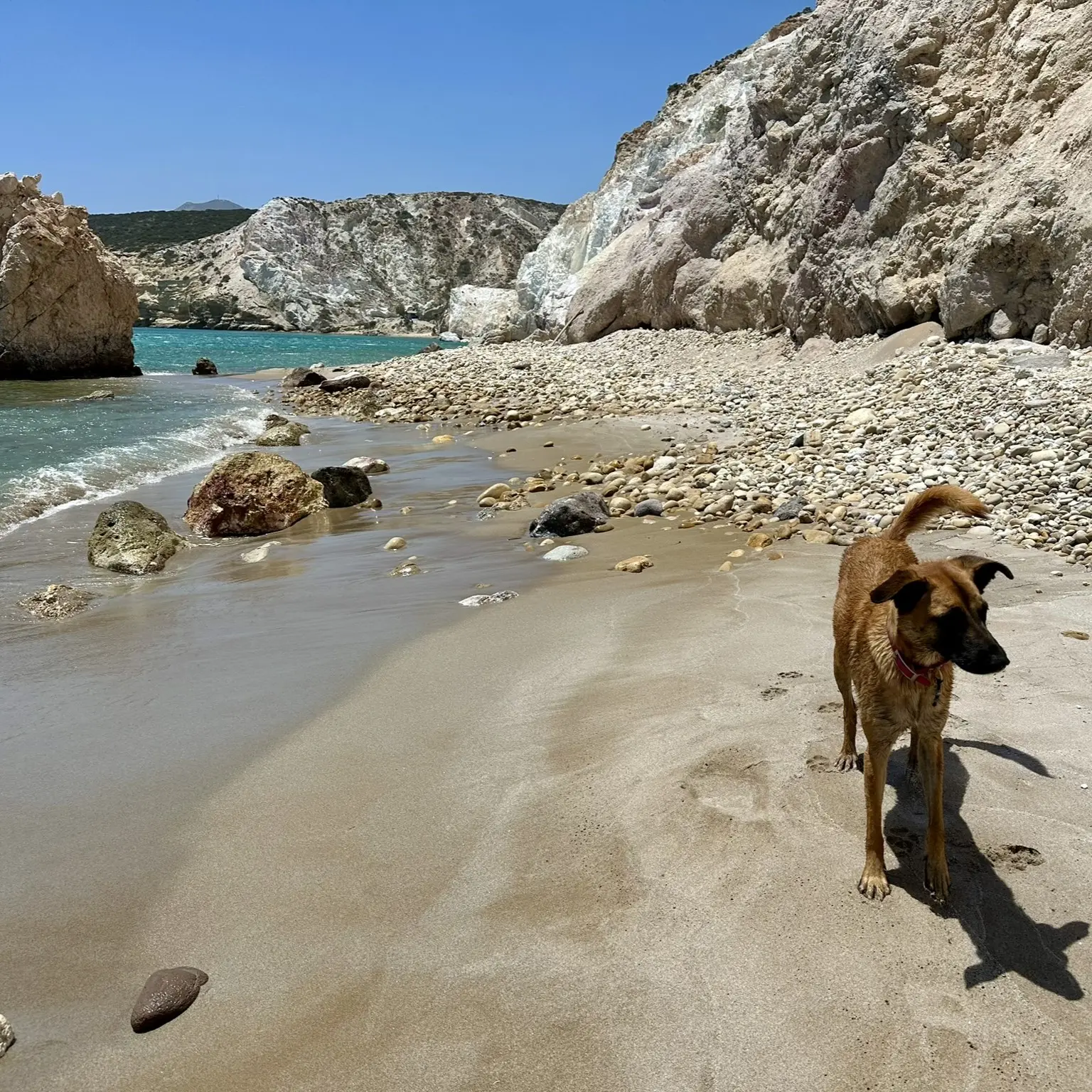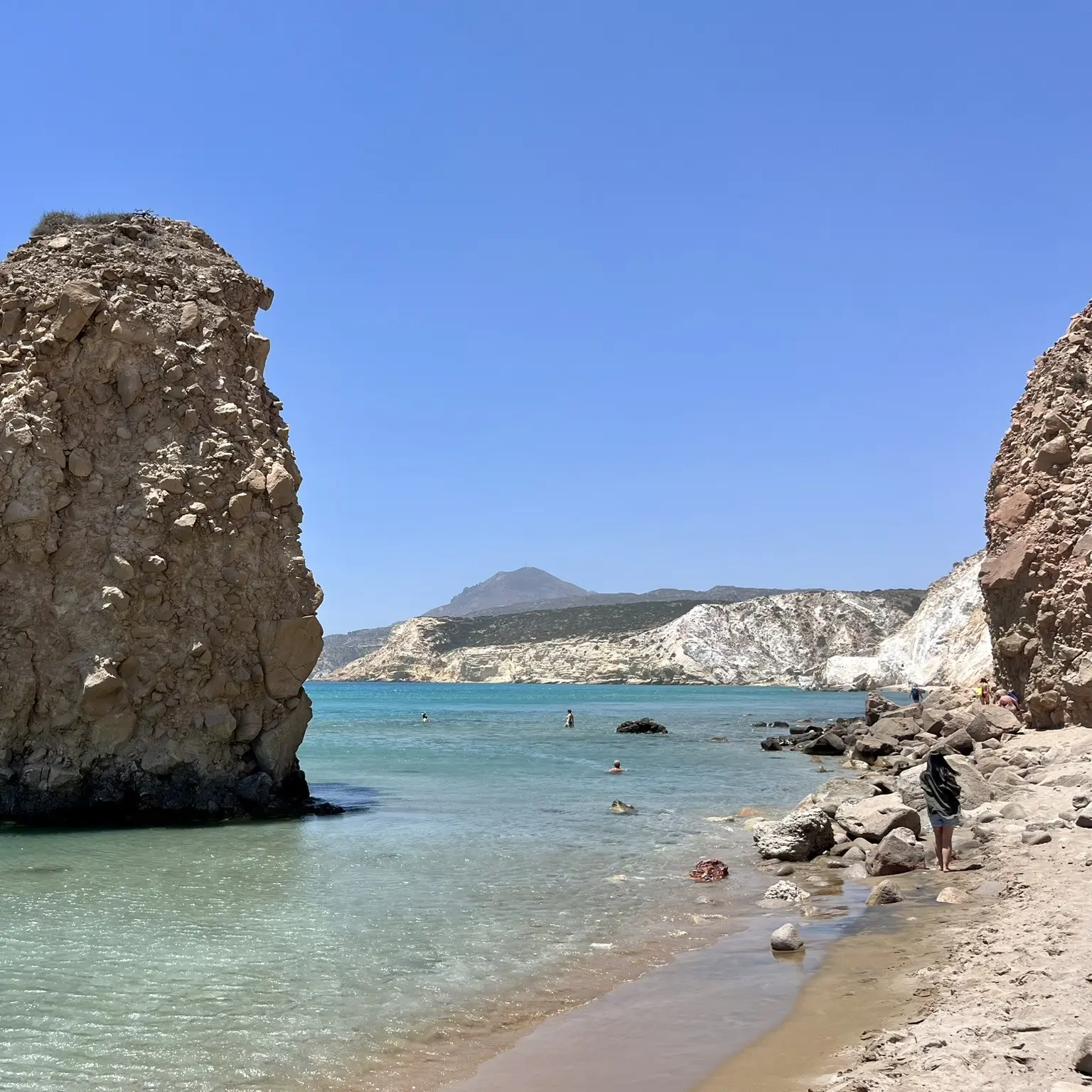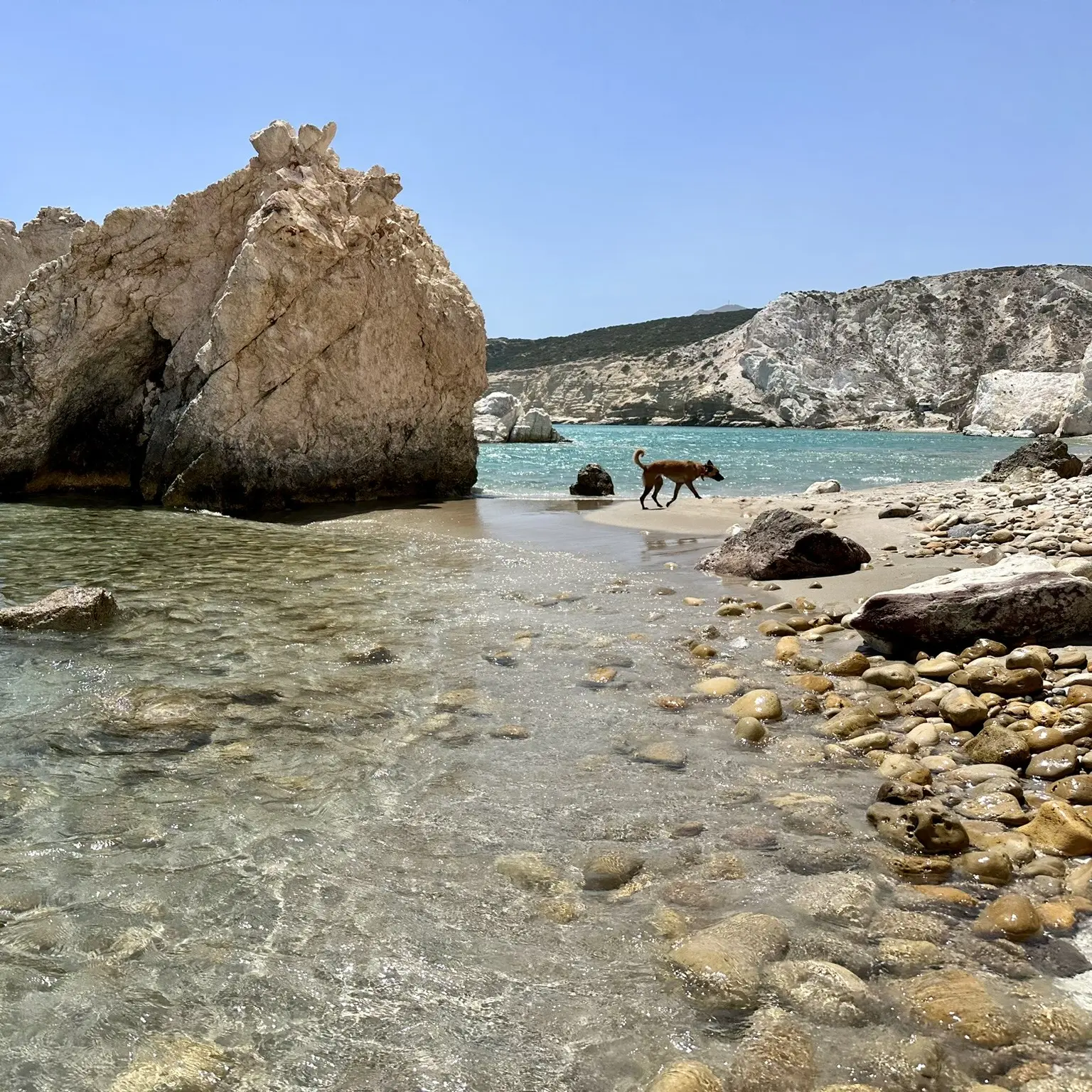 Firiplaka a été notre vrai coup de cœur à Milos ! Mais attention, la première impression était un peu décevante. En arrivant, c’était l’enfer : parasols collés les uns aux autres, serviettes étendues partout et une ambiance très animée. Pas vraiment le coin idéal pour Tika, qui préfère largement les plages plus calmes.