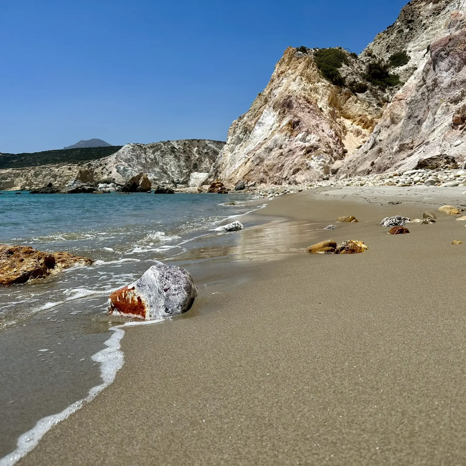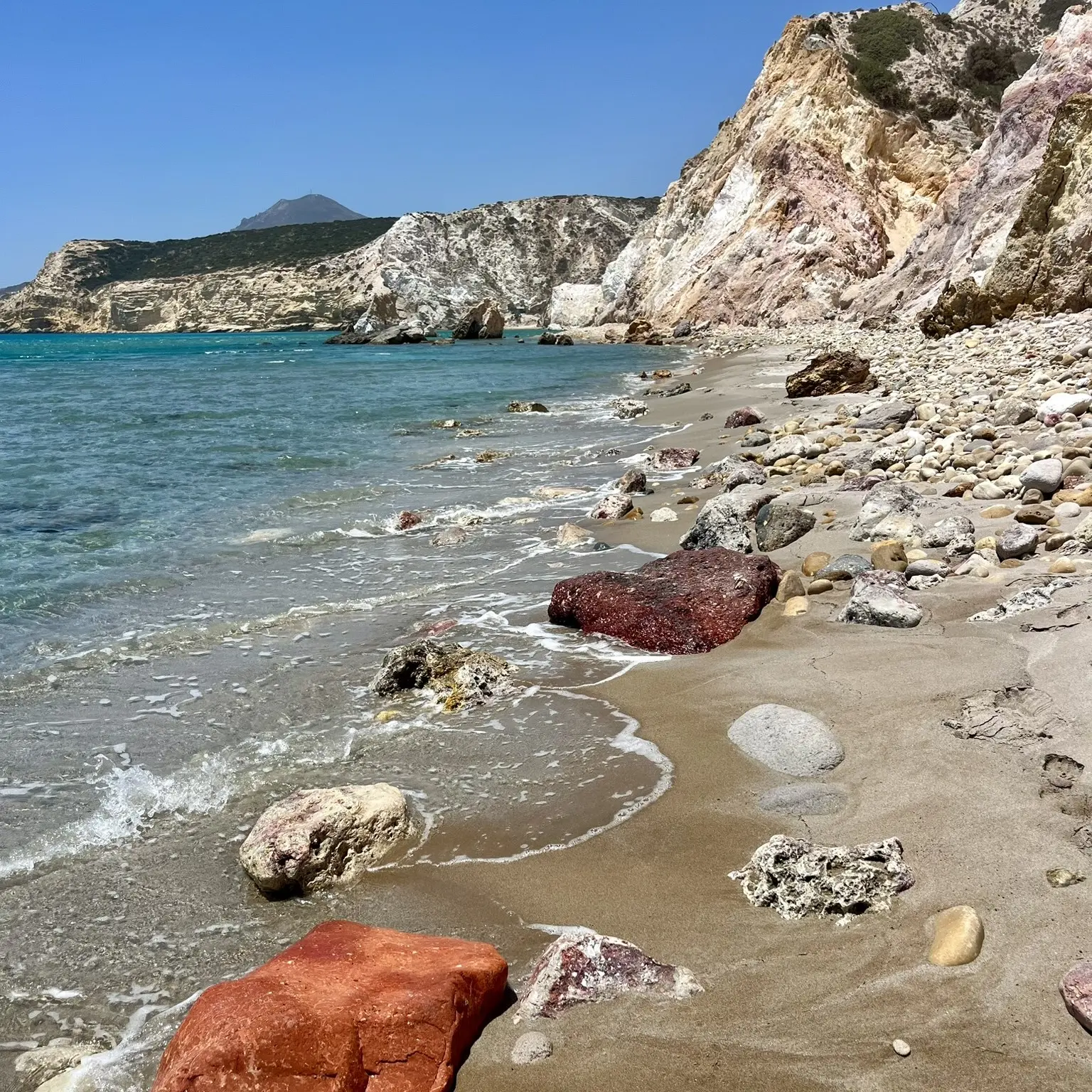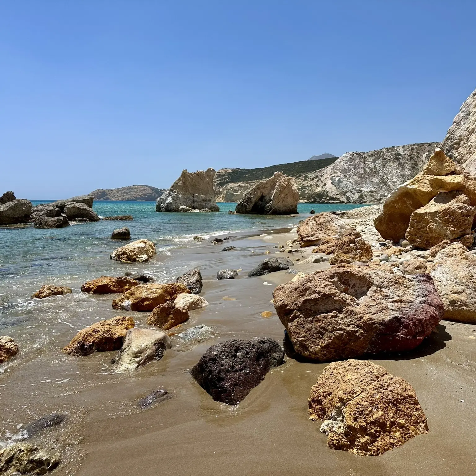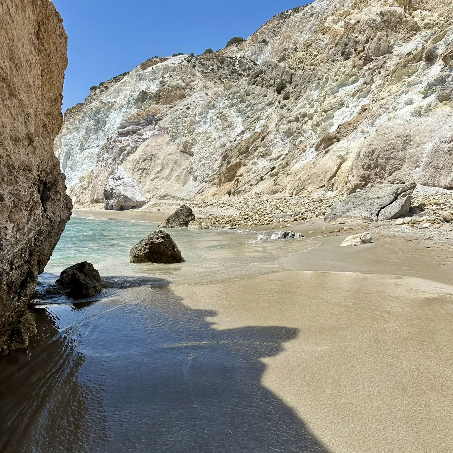 Firiplaka a été notre vrai coup de cœur à Milos ! Mais attention, la première impression était un peu décevante. En arrivant, c’était l’enfer : parasols collés les uns aux autres, serviettes étendues partout et une ambiance très animée. Pas vraiment le coin idéal pour Tika, qui préfère largement les plages plus calmes.