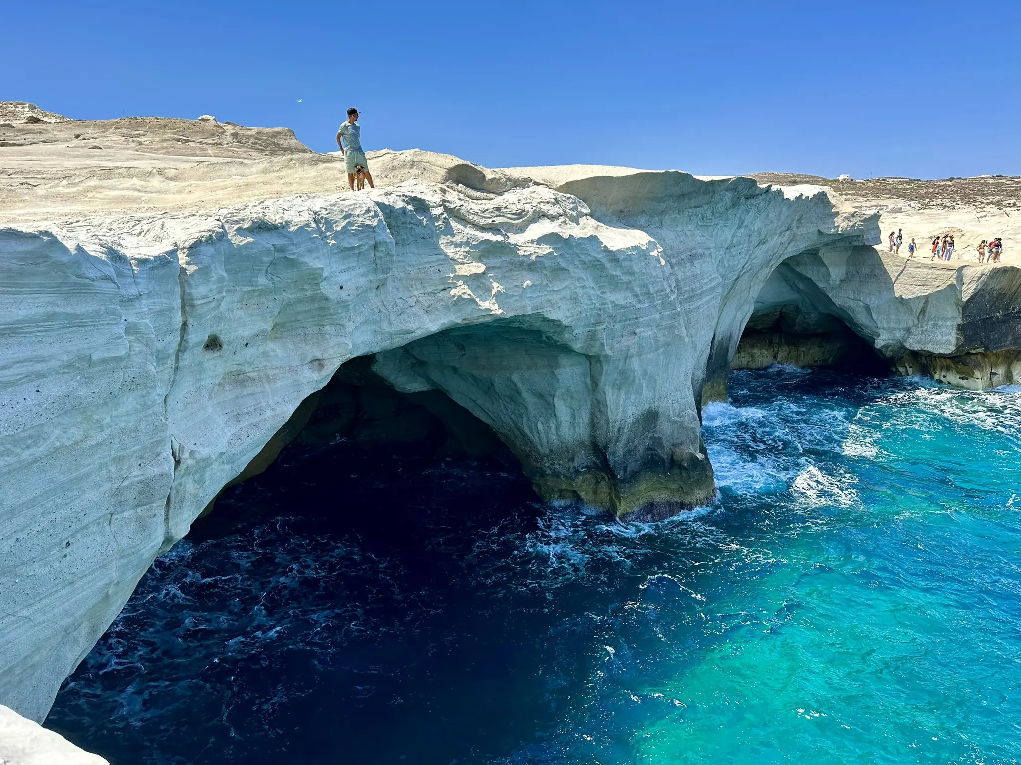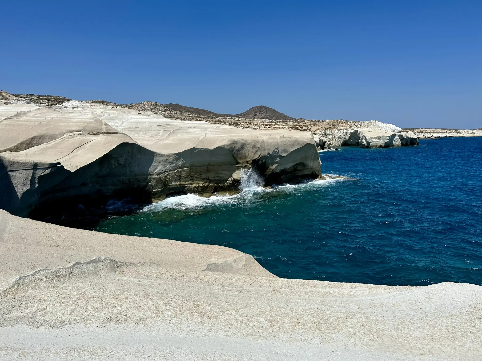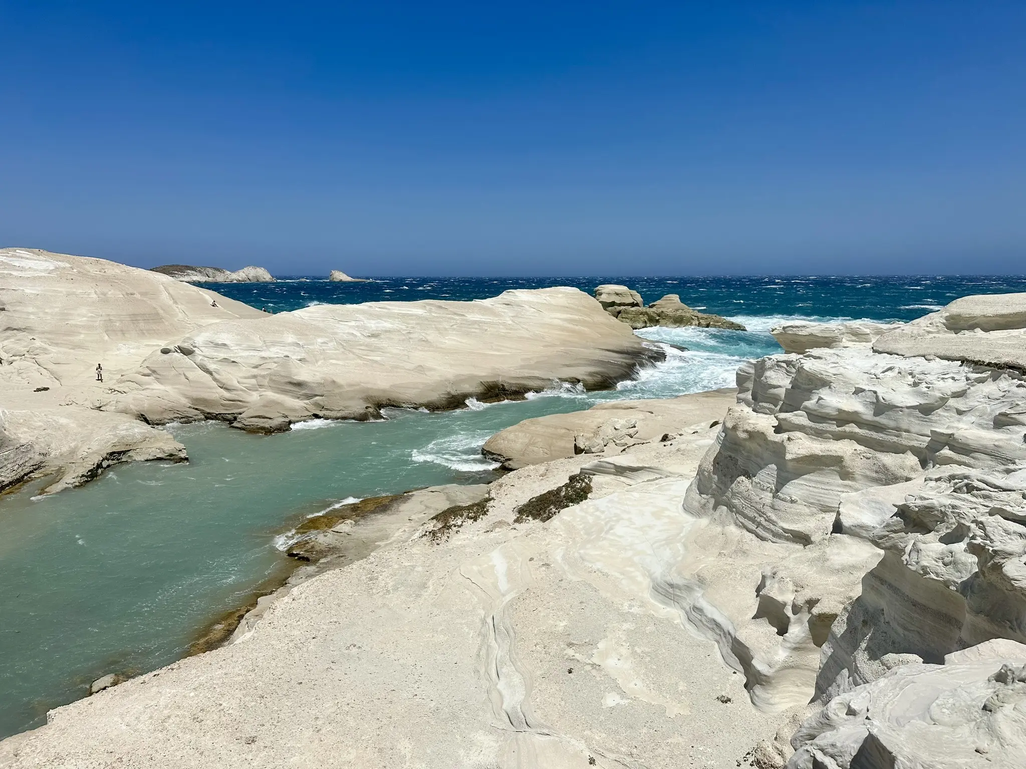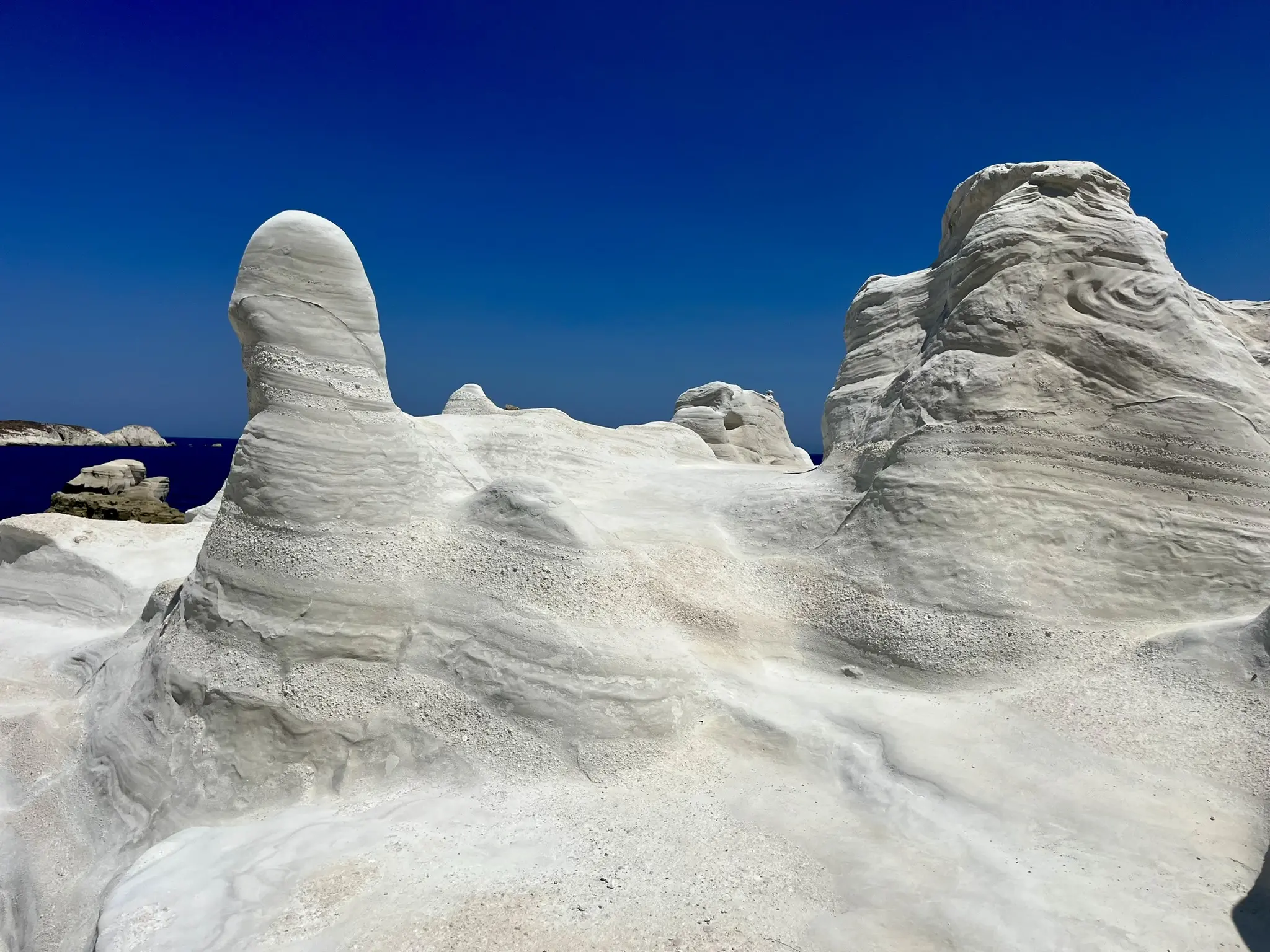 Sarakiniko, c’est LA plage emblématique de Milos. Vous l’avez sûrement déjà vue en photo : des rochers blancs éclatants, l’eau cristalline de la mer Égée en arrière-plan. C’est super facile d’accès : vous garez la voiture, puis un petit chemin piéton vous mène direct au spectacle.
