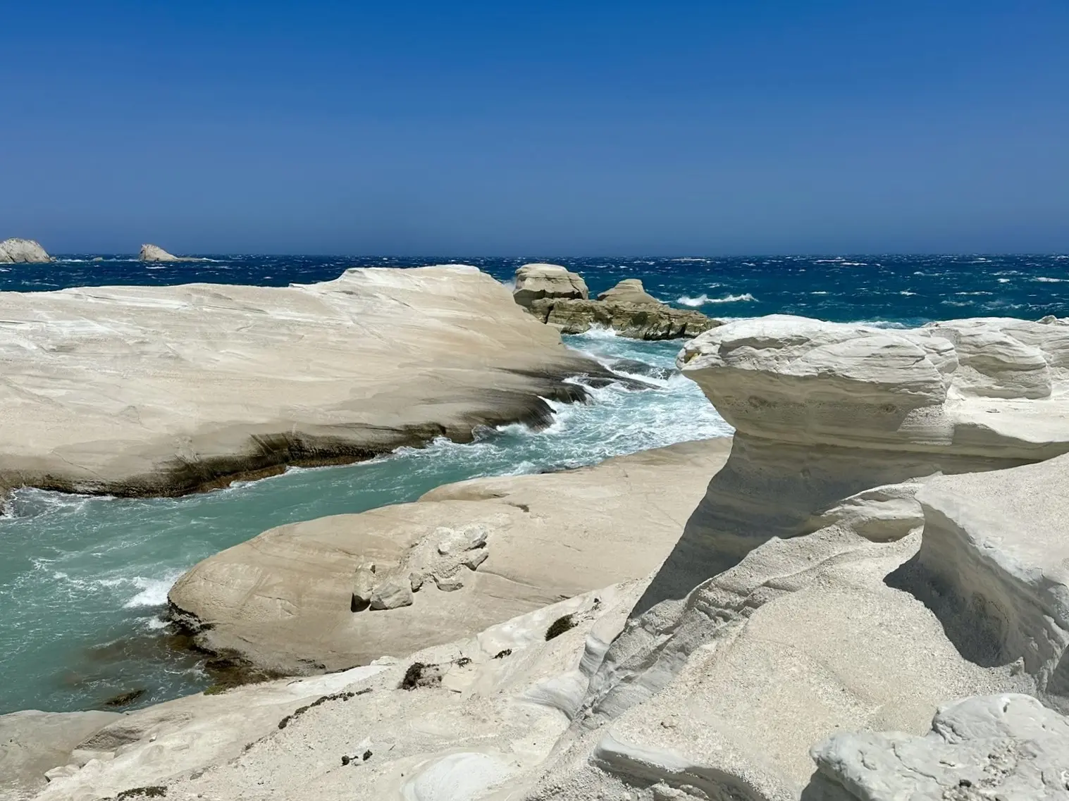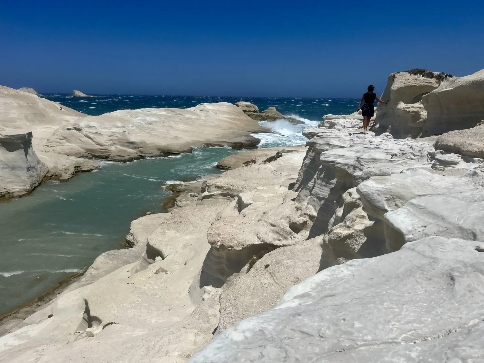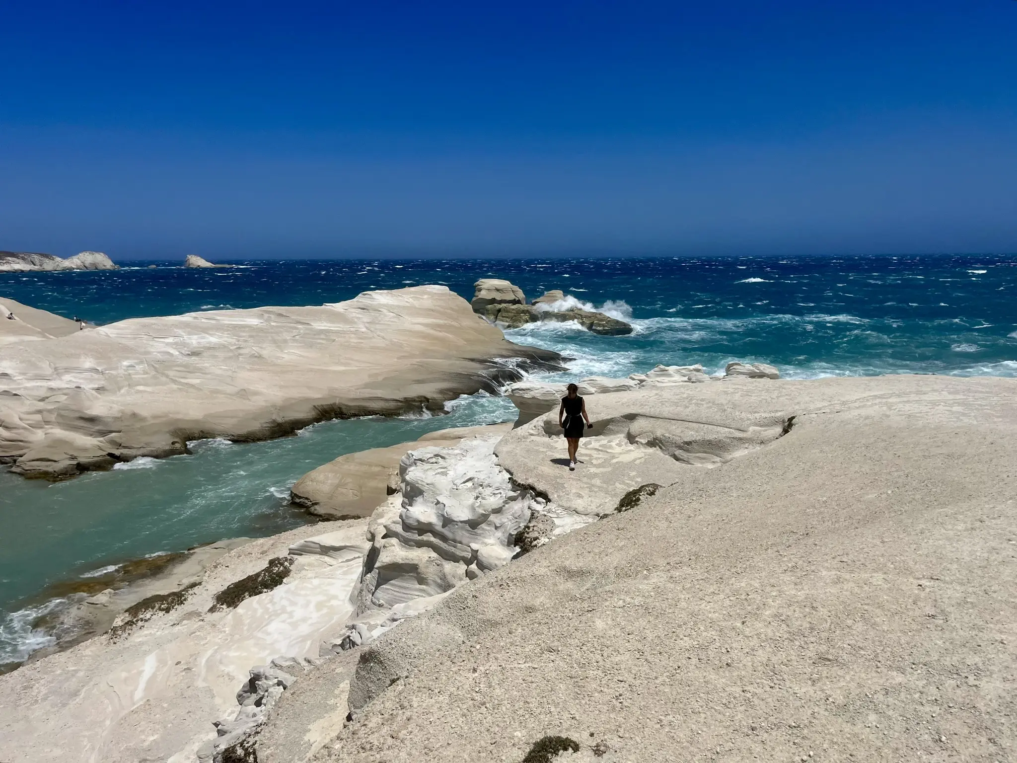 On y est allés deux fois. La première, il y avait un vent de malade qui envoyait les cailloux en mode projectiles, l’endroit était presque désert – top pour des photos ! La deuxième fois, sous un soleil de plomb, la plage était bondée. Si vous êtes plus du genre à chercher la tranquillité, n’hésitez pas à explorer les rochers autour. C’est là que la magie de Sarakiniko se révèle, loin de la foule.