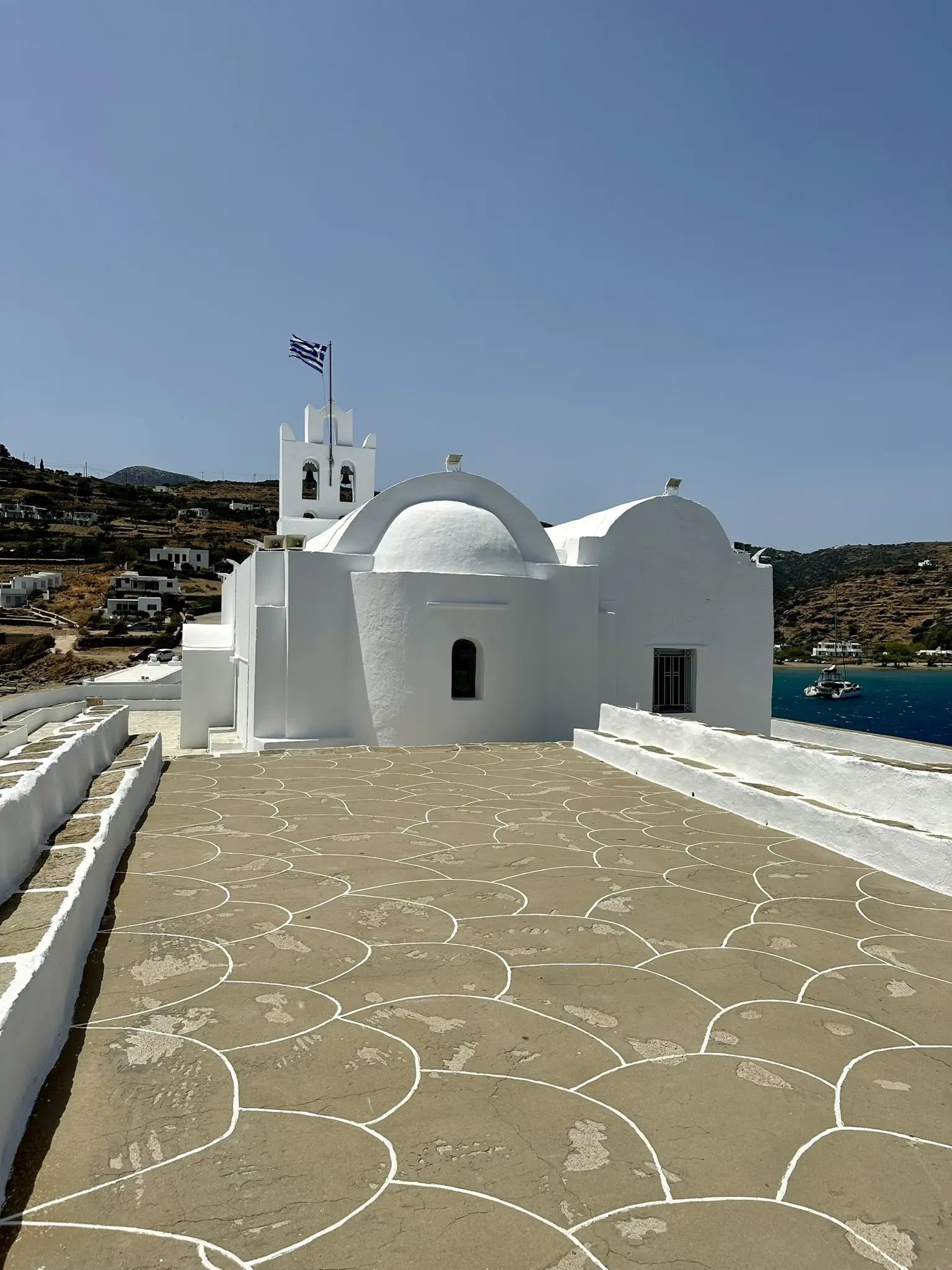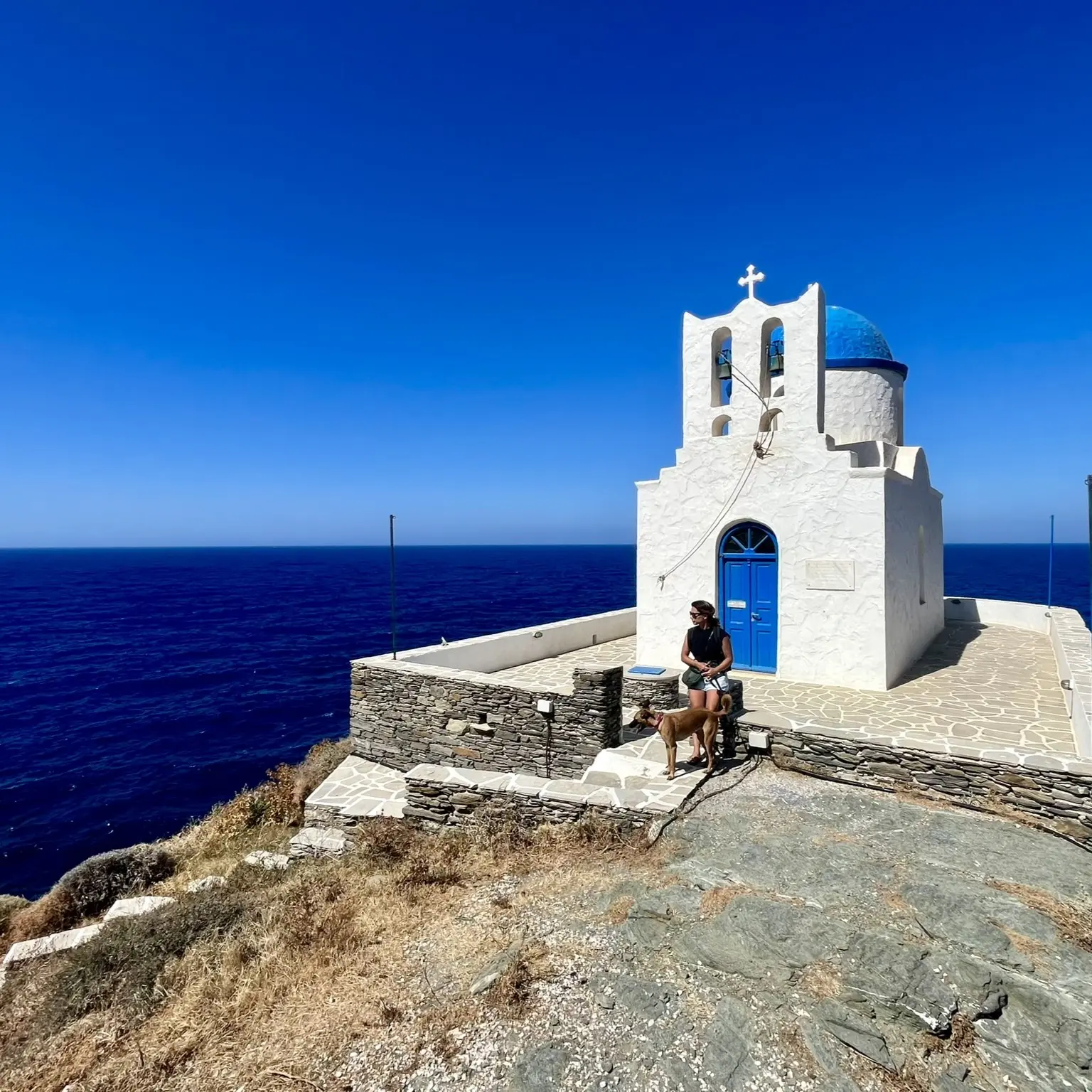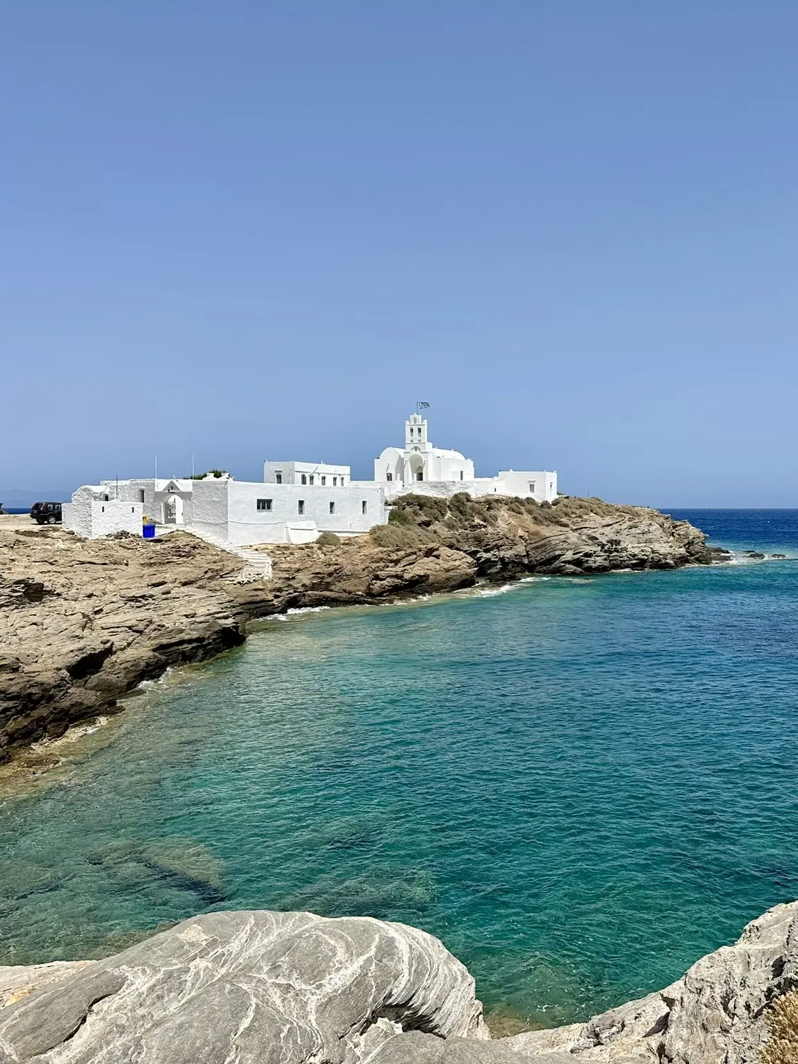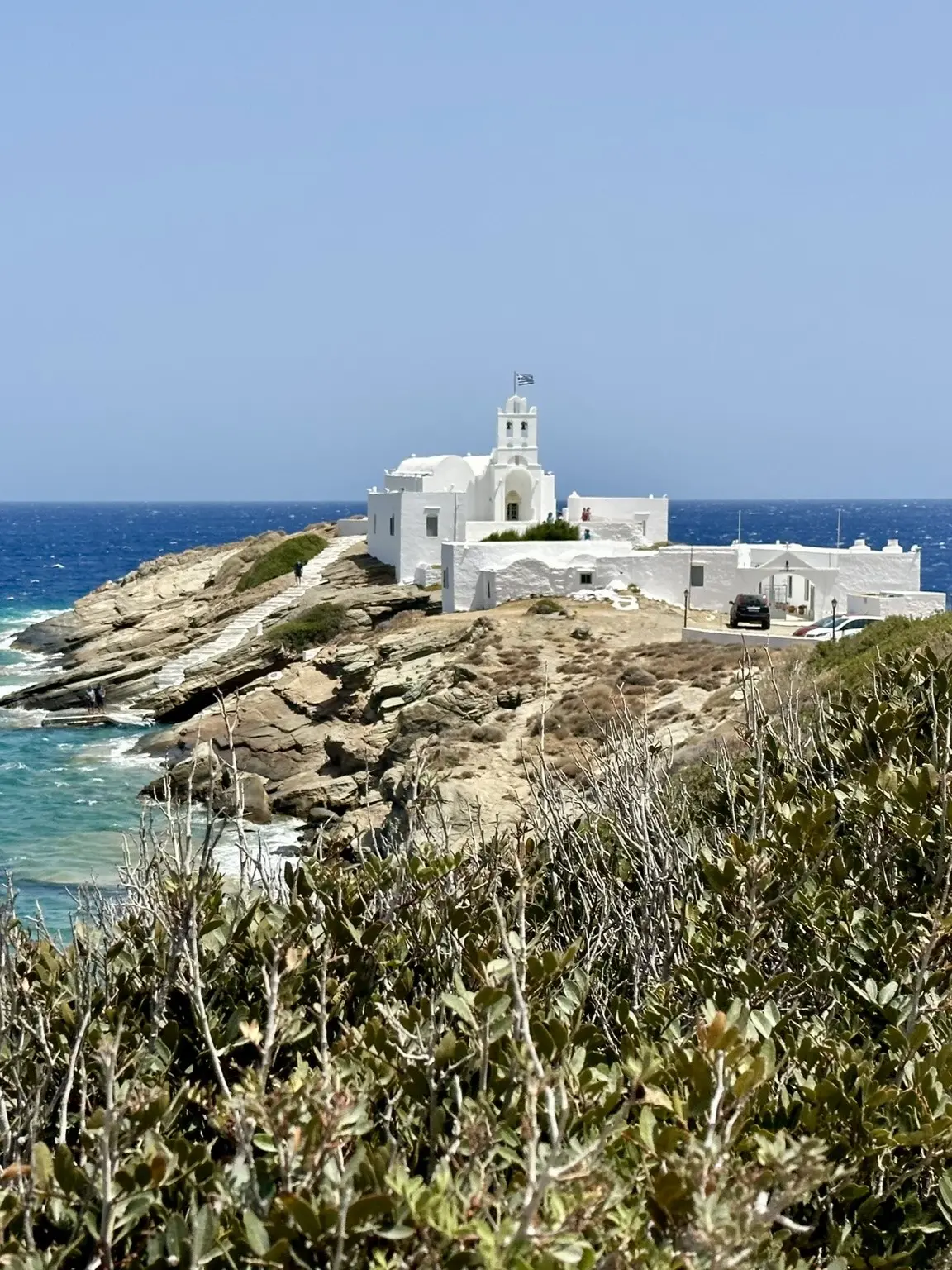 Un incontournable à Sifnos : l’église de Chrissopigi, un monastère perché sur une pointe rocheuse, entouré d’une eau cristalline qui fait rêver. Vous pouvez y aller à pied pour une belle randonnée ou en voiture (avec une petite marche pour explorer les criques cachées). Pour nous, l’aller-retour depuis Fassolou Beach était parfait : 5 km de marche aller-retour, avec des vues magnifiques tout le long du chemin !