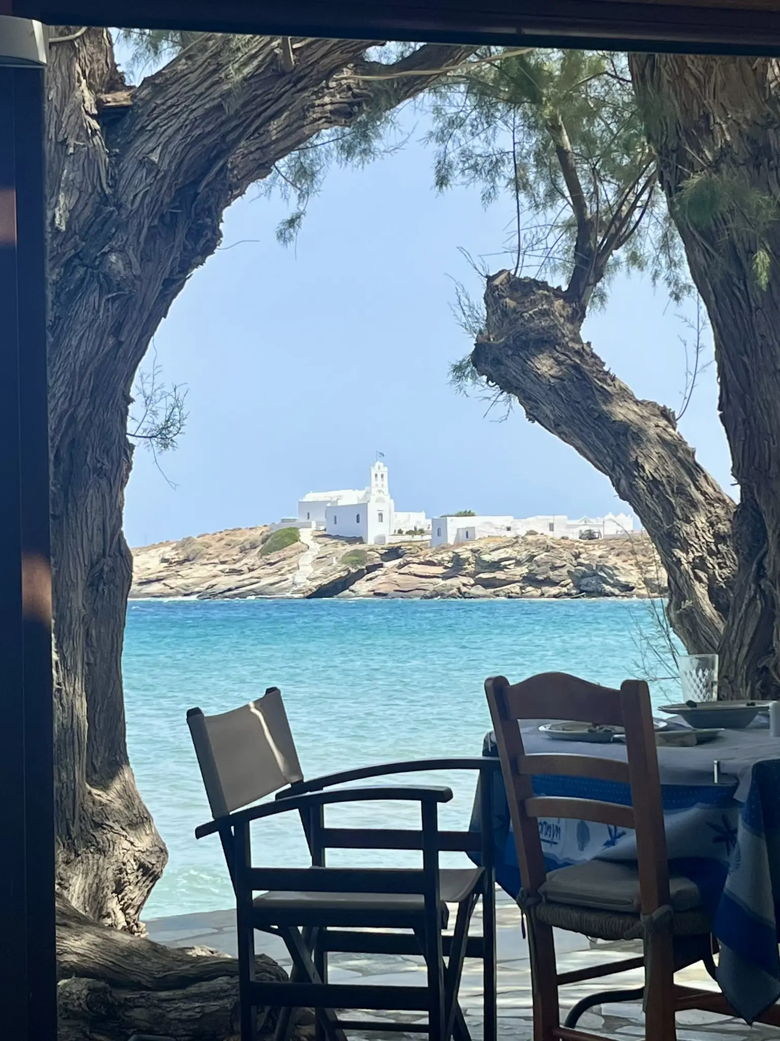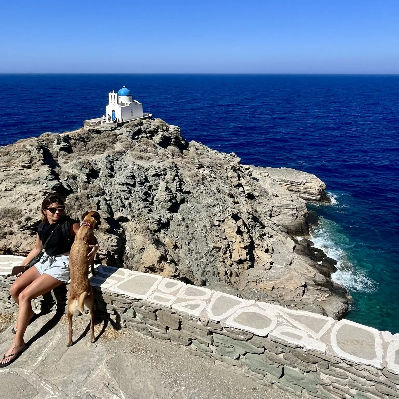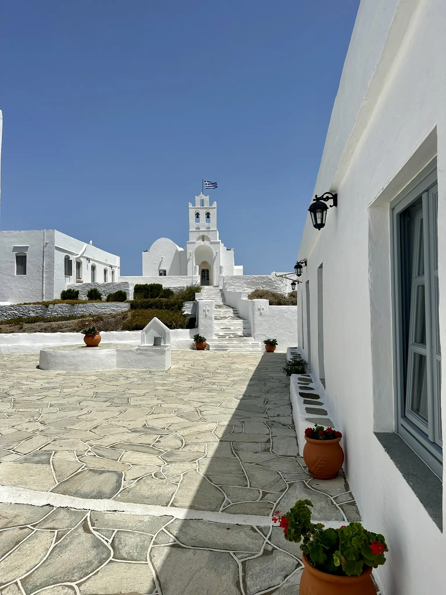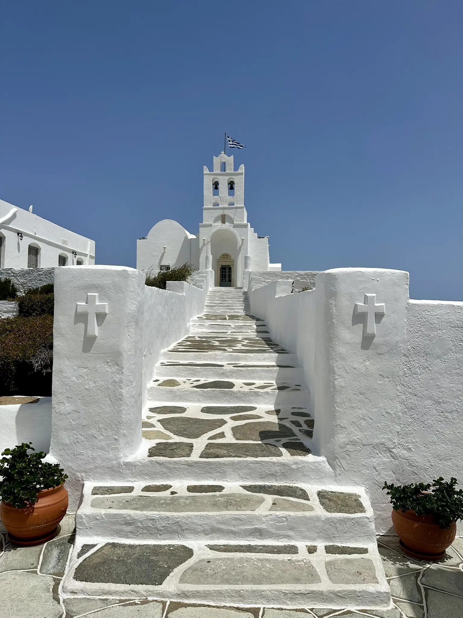 Un incontournable à Sifnos : l’église de Chrissopigi, un monastère perché sur une pointe rocheuse, entouré d’une eau cristalline qui fait rêver. Vous pouvez y aller à pied pour une belle randonnée ou en voiture (avec une petite marche pour explorer les criques cachées). Pour nous, l’aller-retour depuis Fassolou Beach était parfait : 5 km de marche aller-retour, avec des vues magnifiques tout le long du chemin !