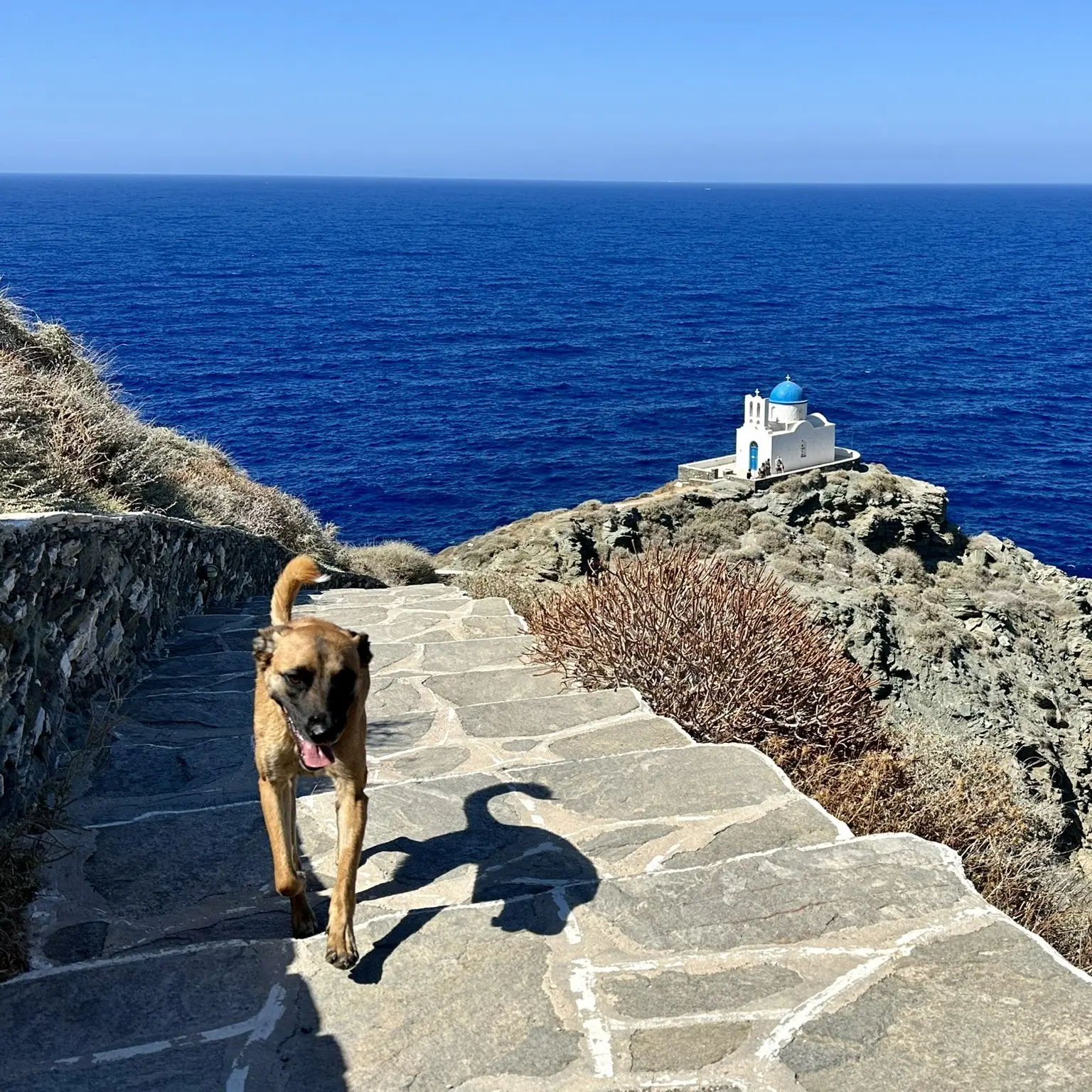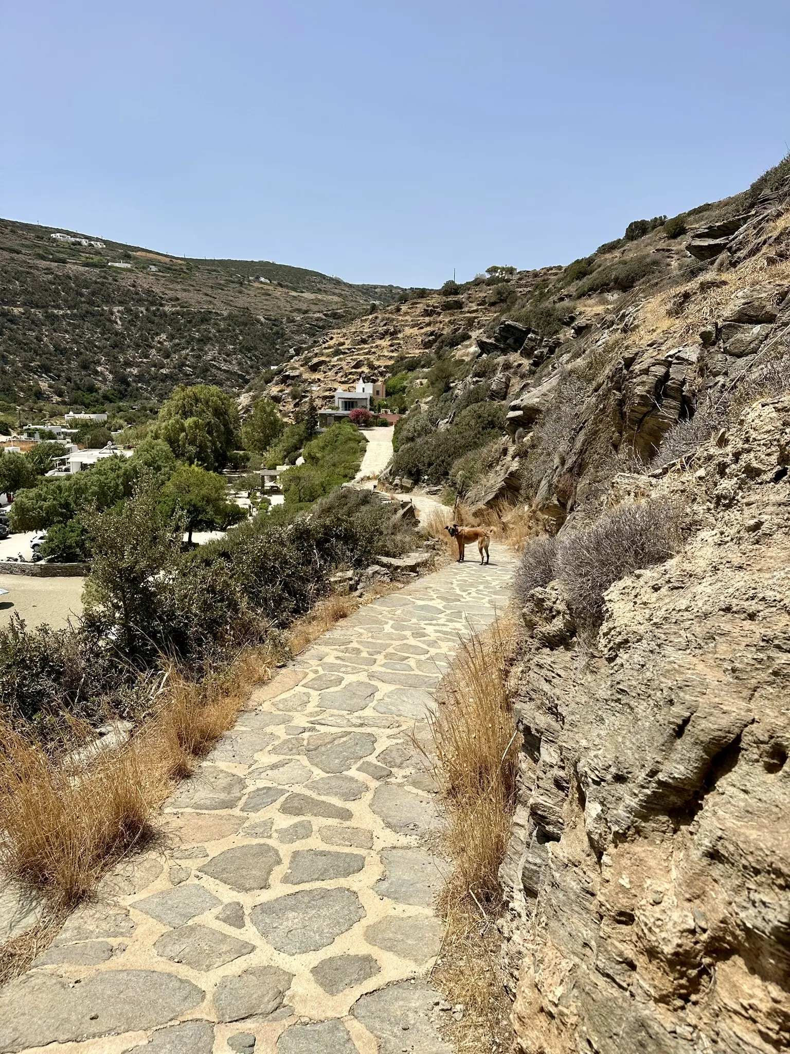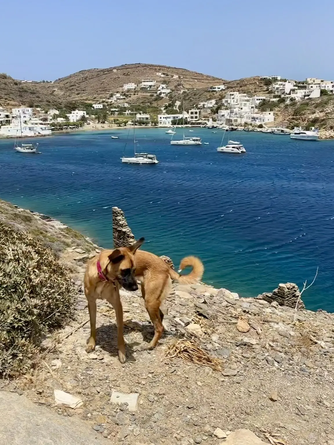 En fin de matinée, on a décidé de s’attaquer au sentier qui mène à Fikiada Beach. Le soleil était au zénith et il n’y avait quasi aucune ombre sur le chemin ! On a dû faire pas mal de pauses « eau fraîche et chill » pour Tika, histoire qu’elle ne souffre pas trop de cette chaleur. Et au bout du sentier, grosse surprise : juste avant Fikiada Beach, on est tombés sur une petite plage déserte, juste parfaite pour un moment tranquille. Du sable argenté, des chèvres qui nous regardent comme des spectatrices, et une baignade snorkelling mémorable. C’était vraiment magique !