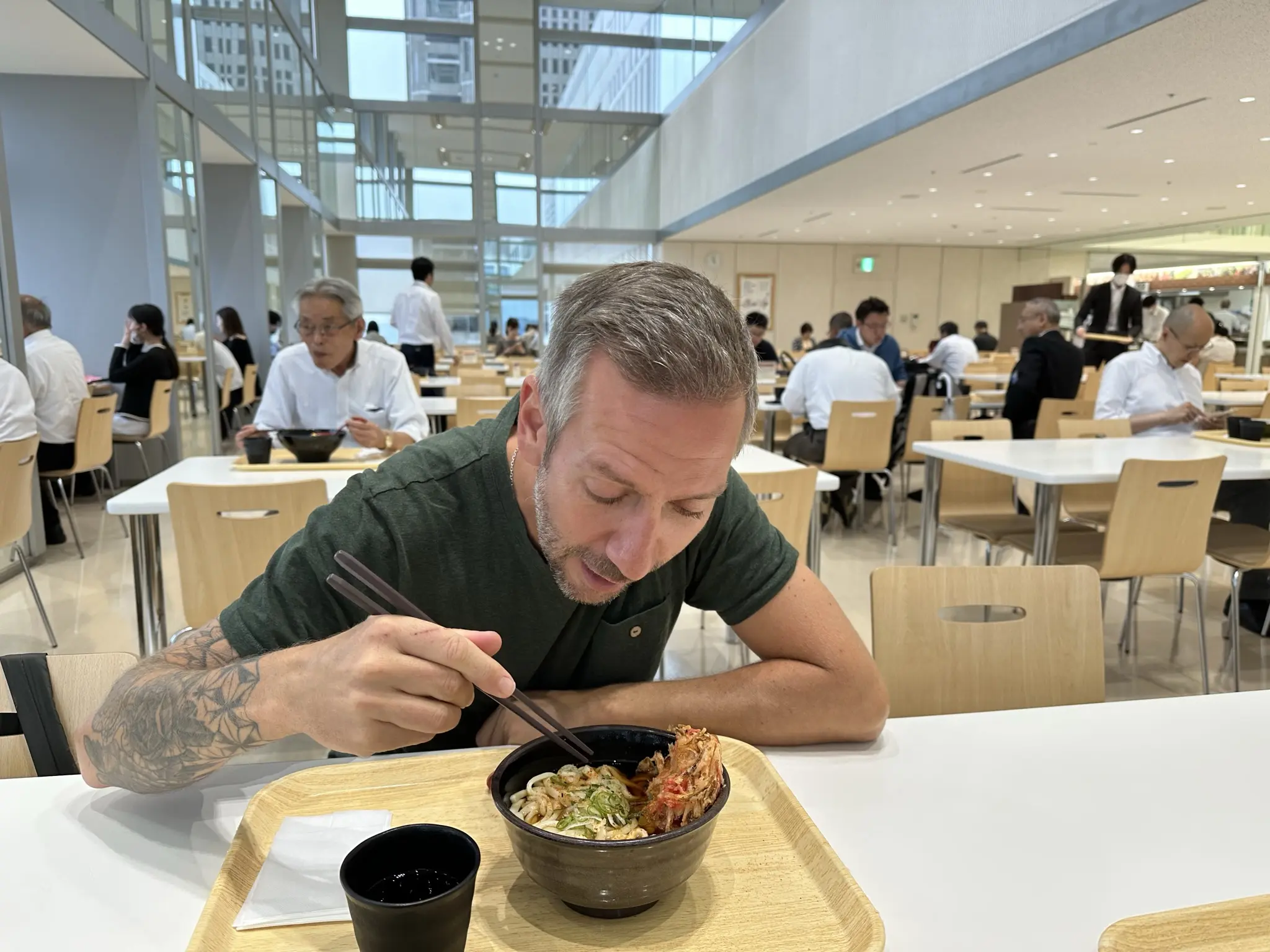 Shinjuku, c’est le quartier qui ne dort jamais. Il y a tout : des magasins, des restaurants, des bars, et même des coins tranquilles comme le jardin Shinjuku Gyoen. On grimpe au 45ème étage du siège du gouvernement métropolitain pour admirer la vue panoramique sur la ville, mais la pluie en a décidé autrement… pas de chance pour nous, Tokyo nous cache sa vue dégagée aujourd’hui. Après, on file au restaurant du bâtiment, où l’on est les seuls touristes. Ce resto, fréquenté par des employés de bureau, propose une cuisine correcte et abordable. C’est une expérience sympa de s’intégrer à la vie locale, et le mix entre le cadre professionnel et la nourriture simple, mais bonne, nous plaît beaucoup.