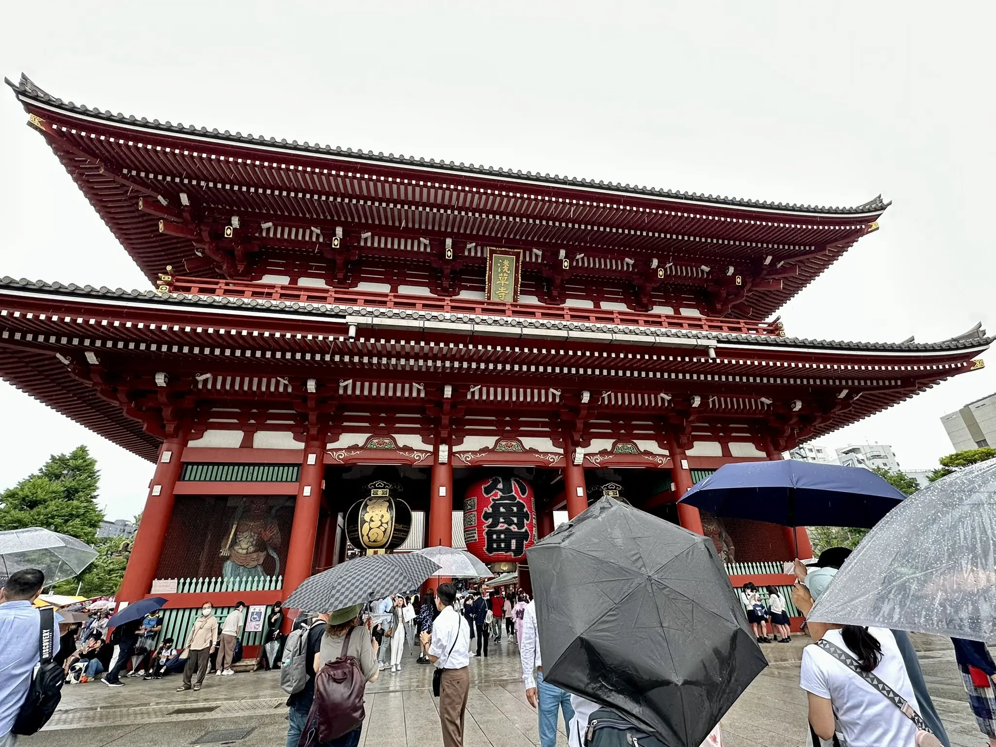 Asakusa, c’est un peu le cœur historique de Tokyo, et c’est là qu’on commence. Le temple Senso-ji, l’un des plus anciens et vénérés du Japon, nous attend, avec sa grande pagode de 5 étages et sa ruelle commerçante, la Nakamise-dōri. C’est le paradis des souvenirs et des petites spécialités locales à goûter. Malgré la foule, l’atmosphère reste plutôt calme et on sent bien l’influence de l’histoire ancienne de la ville. Après avoir fait le tour, je trouve un super t-shirt avec des fleurs de sakura qui deviennent roses au soleil… je suis fan !