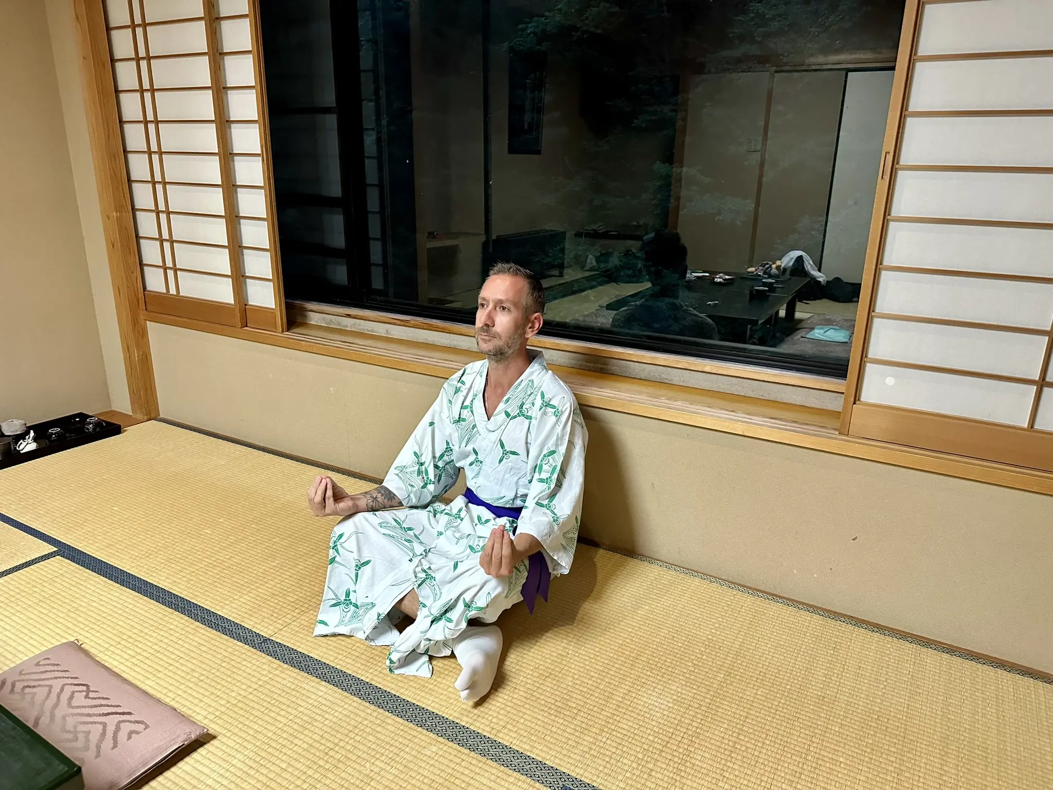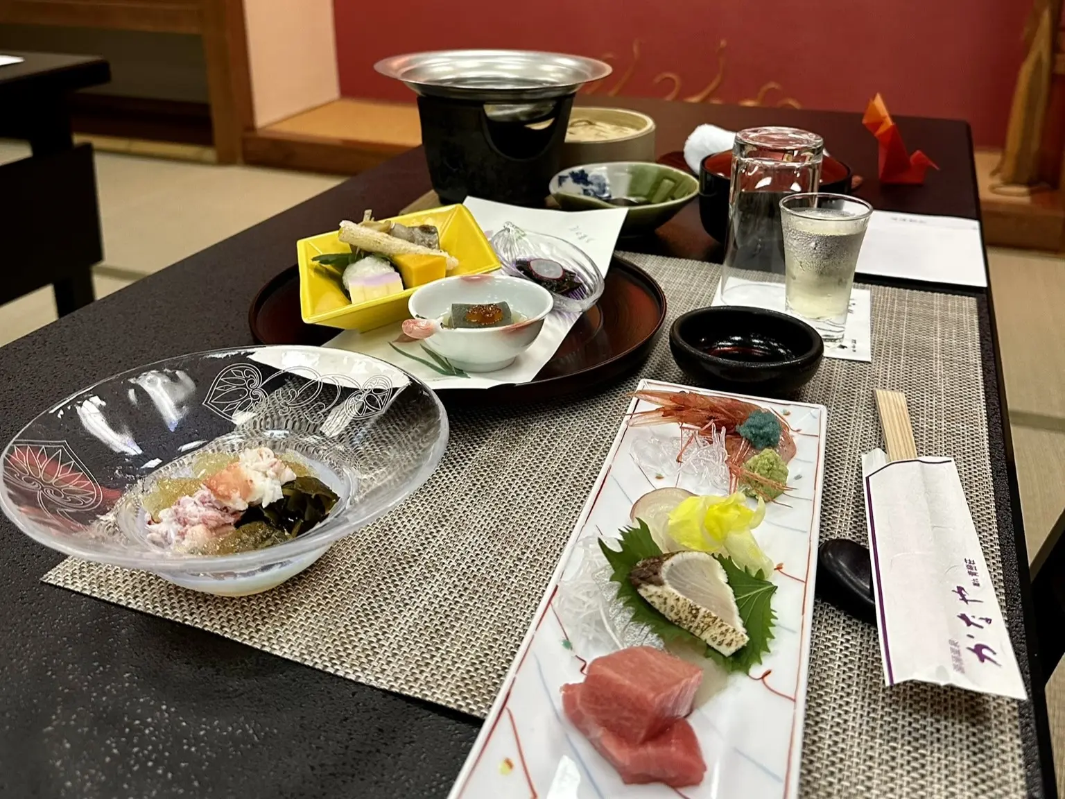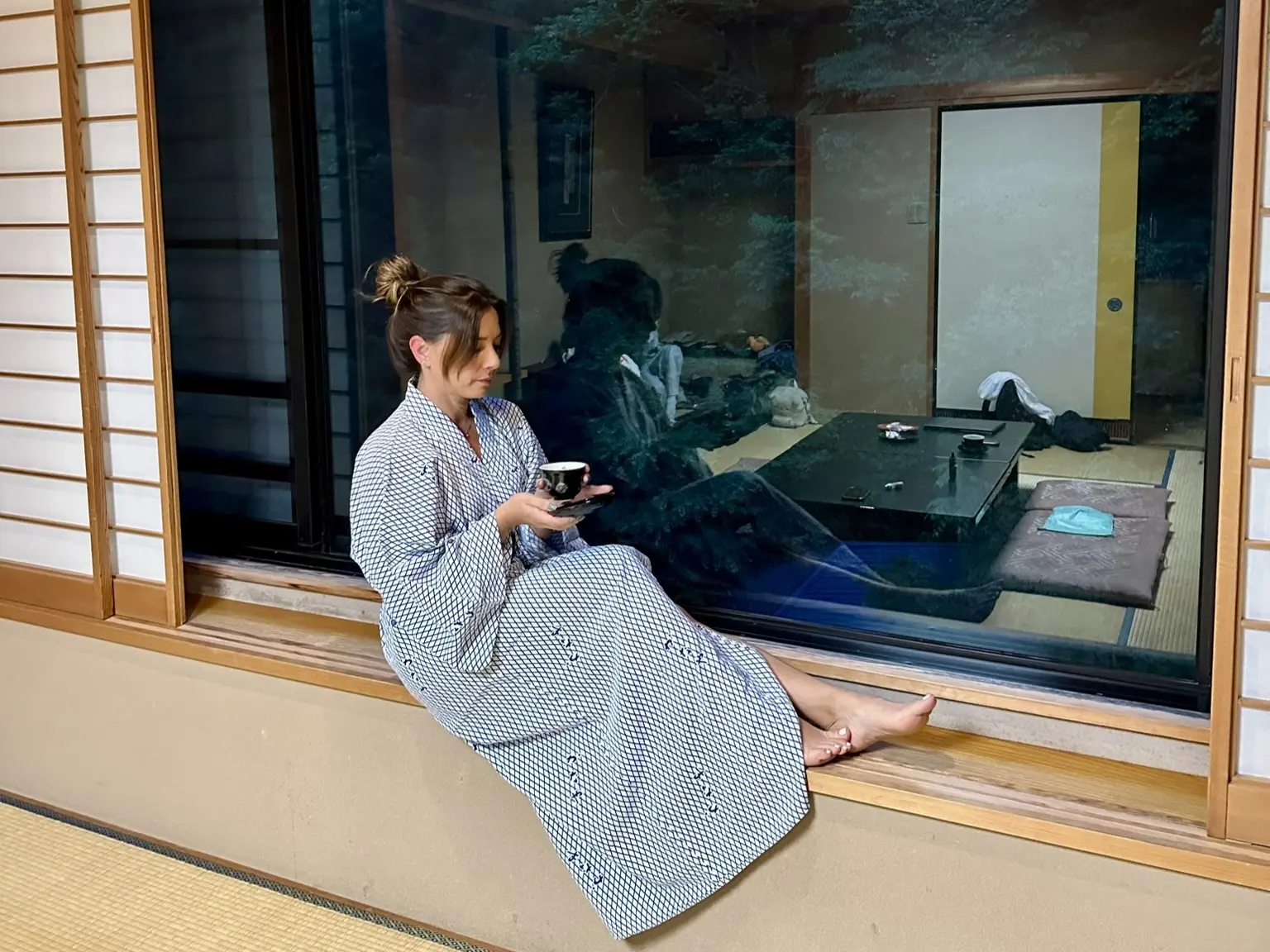 La journée se termine en beauté à l’auberge japonaise traditionnelle Utaimachi, où ma mère nous a réservés une nuit pour fêter l’anniversaire de mon père. Dès notre arrivée, on est invités à prendre le thé, une belle manière de commencer la soirée dans ce magnifique ryokan. Ensuite, chacun se prépare pour le bain (bains communs pour certains, douche pour d’autres), avant de revêtir les kimonos fournis par l’auberge. Bien sûr, on réussit à inverser les kimonos homme/femme, ce qui déclenche un fou rire général (et une petite gêne chez les hôtesses). Après un petit échange de vêtements (je prends celui de mon frère et vice-versa), on se retrouve prêts à manger. Et là, c’est la fête : plus d’une dizaine de plats délicieux, tous plus savoureux les uns que les autres. On termine la soirée le ventre bien rempli, allongés sur nos tatamis, prêts à passer une nuit bien méritée dans ce cadre traditionnel et apaisant.