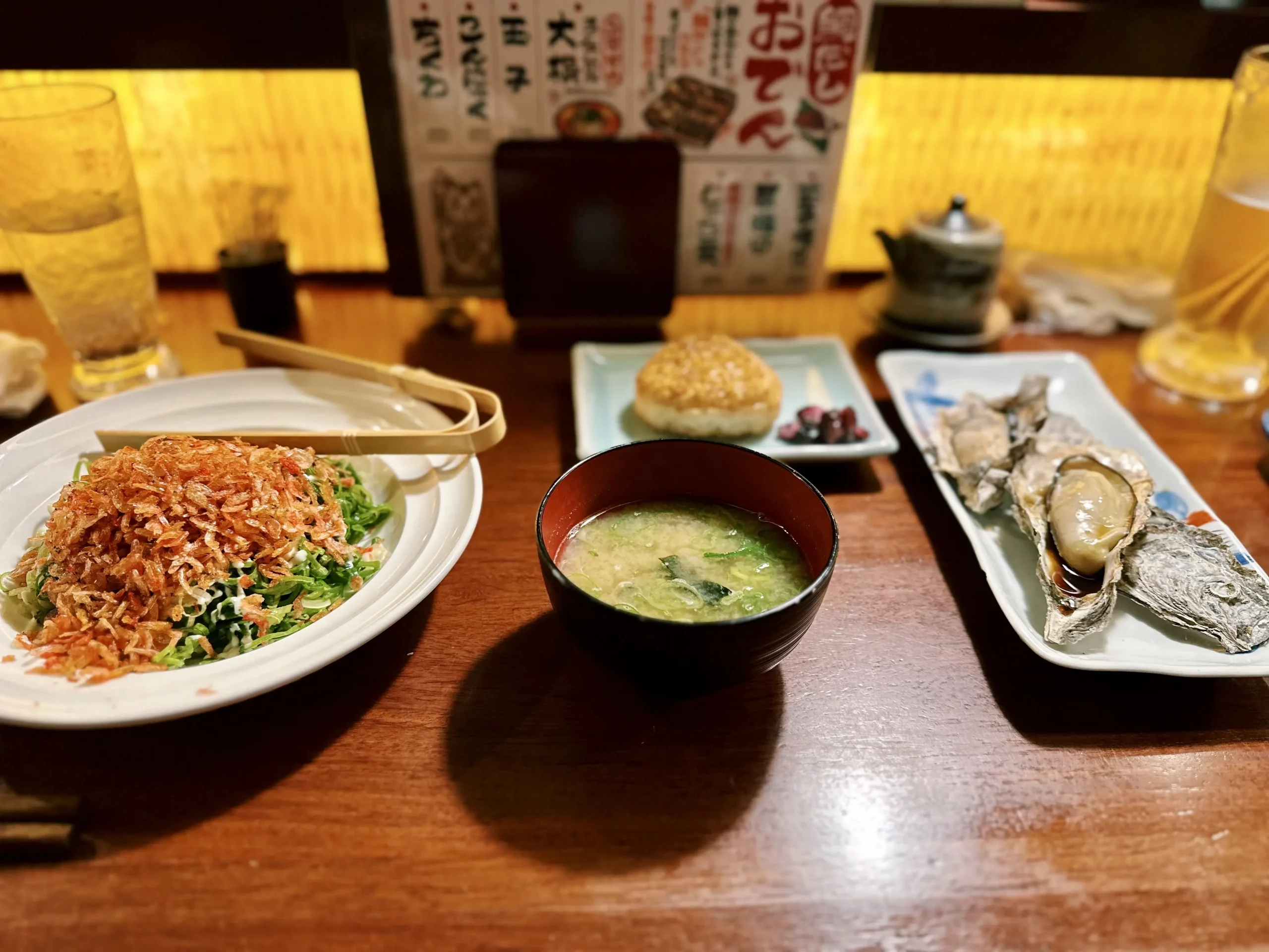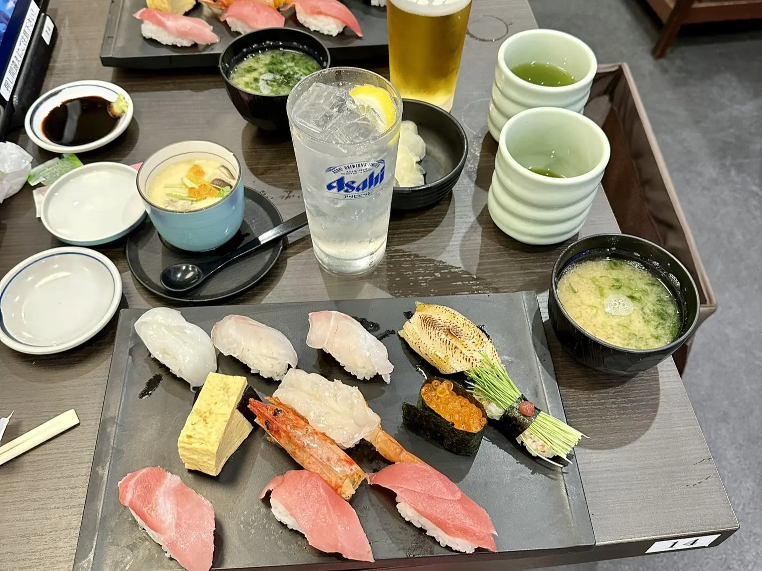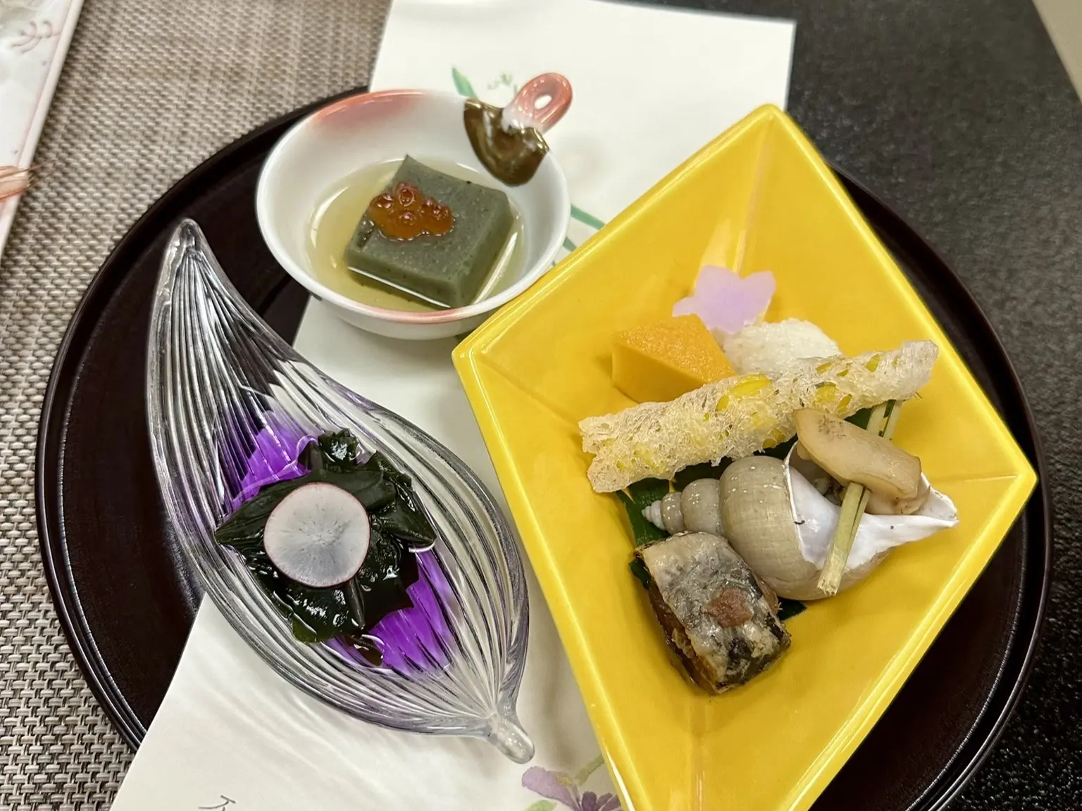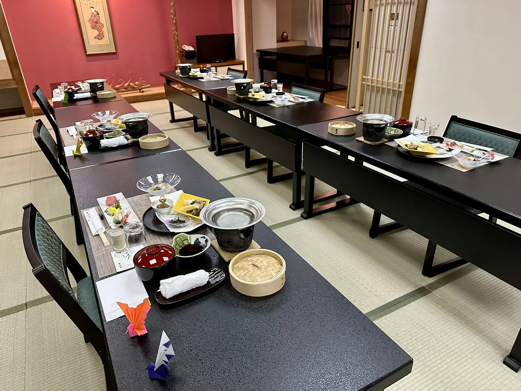 La journée se termine en beauté à l’auberge japonaise traditionnelle Utaimachi, où ma mère nous a réservés une nuit pour fêter l’anniversaire de mon père. Dès notre arrivée, on est invités à prendre le thé, une belle manière de commencer la soirée dans ce magnifique ryokan. Ensuite, chacun se prépare pour le bain (bains communs pour certains, douche pour d’autres), avant de revêtir les kimonos fournis par l’auberge. Bien sûr, on réussit à inverser les kimonos homme/femme, ce qui déclenche un fou rire général (et une petite gêne chez les hôtesses). Après un petit échange de vêtements (je prends celui de mon frère et vice-versa), on se retrouve prêts à manger. Et là, c’est la fête : plus d’une dizaine de plats délicieux, tous plus savoureux les uns que les autres. On termine la soirée le ventre bien rempli, allongés sur nos tatamis, prêts à passer une nuit bien méritée dans ce cadre traditionnel et apaisant.