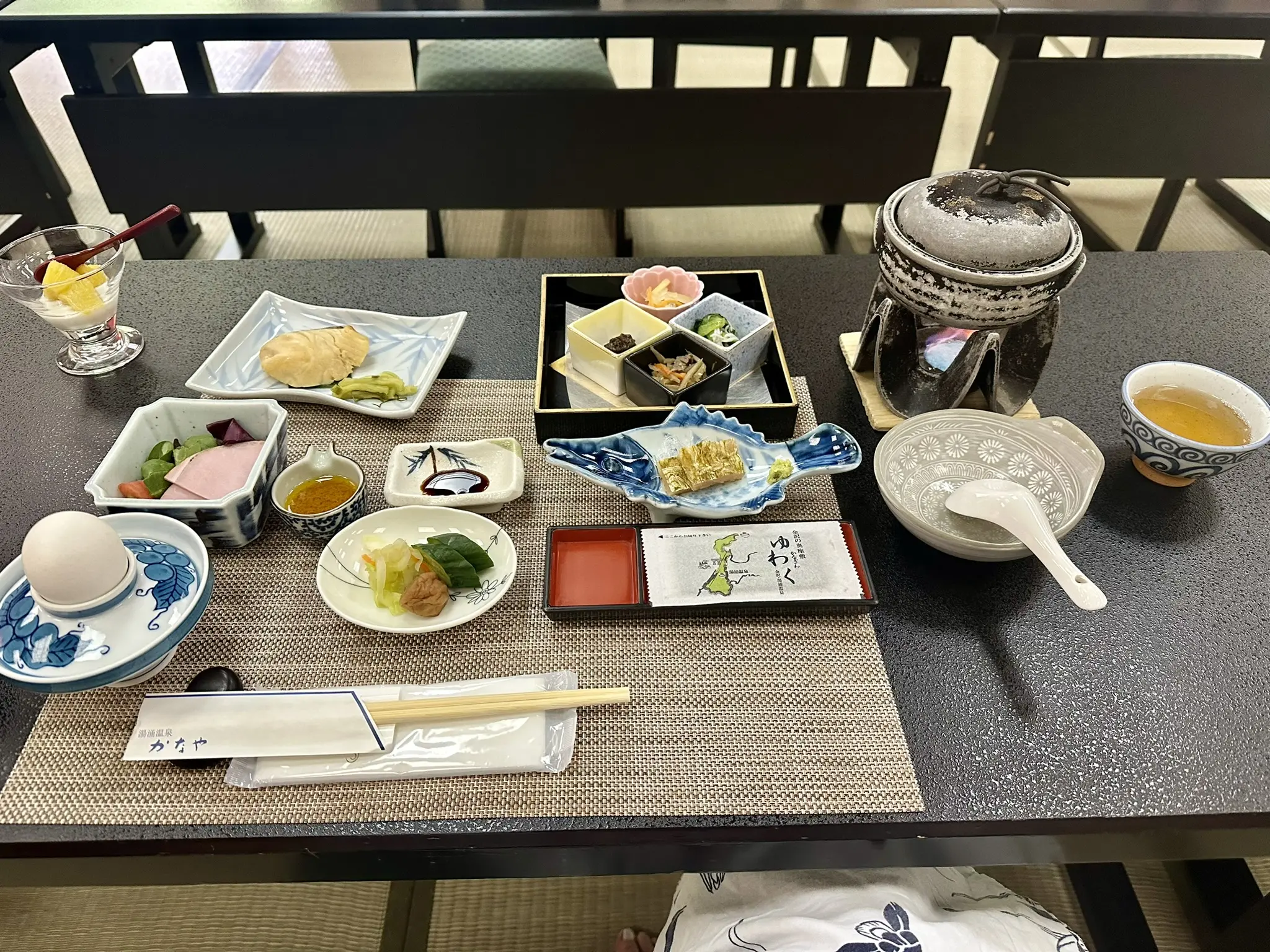 Le lendemain matin, direction le petit-déjeuner préparé dans notre ryokan. Et une fois de plus, c’est copieux ! J’ai tellement mangé la veille que je n’arrive pas à tout finir ! Quel regret en revoyant ce petit-déjeuner en photo !