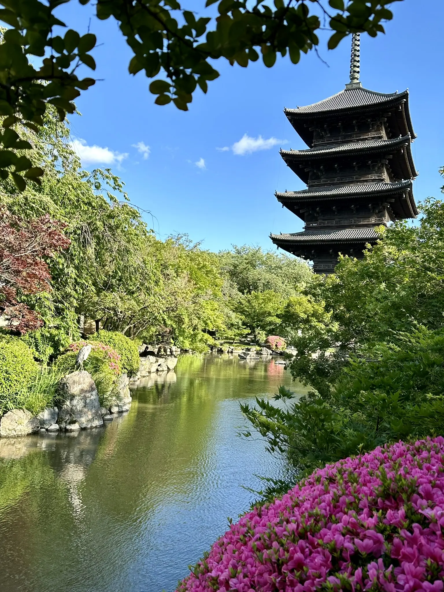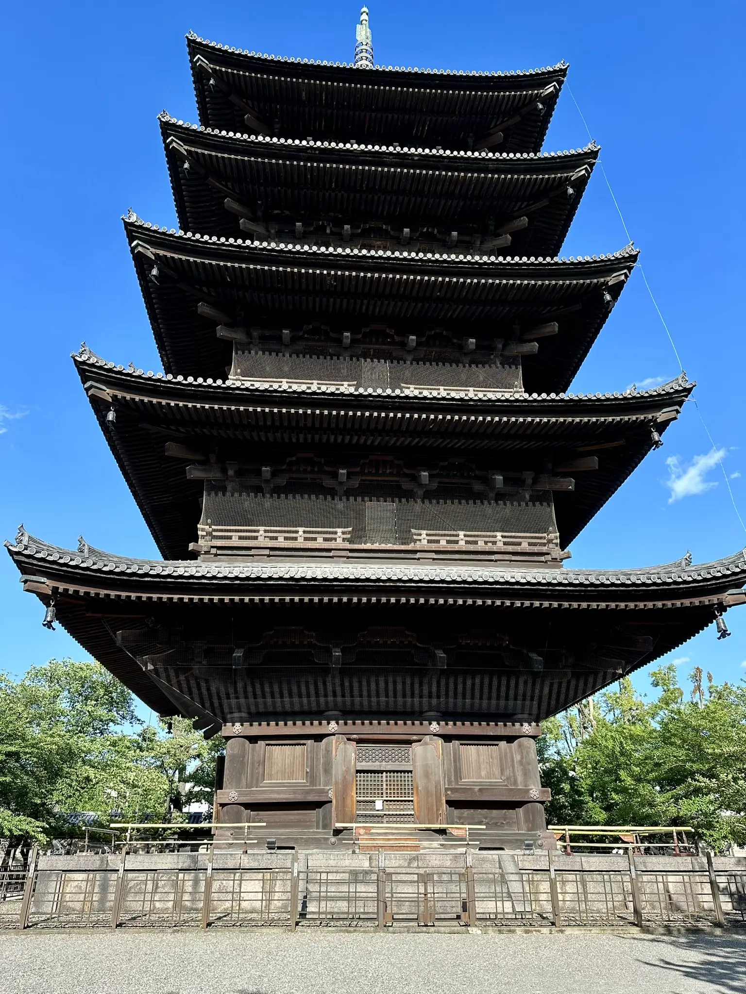 Après la nuit agréable au ryokan, nous disons au revoir à mes parents qui rentrent à Tokyo, et c’est parti pour Kyoto avec Gilou, Jun, Jesse et Antho ! Une nouvelle aventure qui commence. Après avoir installé nos affaires au logement et fait un petit détour par le lavomatique (ah, les joies des voyages en groupe), on part direct au temple To-ji en fin de journée. Ce temple est impressionnant avec sa pagode de 55 mètres de haut, la plus grande du Japon et classée au Patrimoine de l’Unesco. Le jardin japonais autour du plan d’eau est super apaisant, parfait pour une petite pause zen.