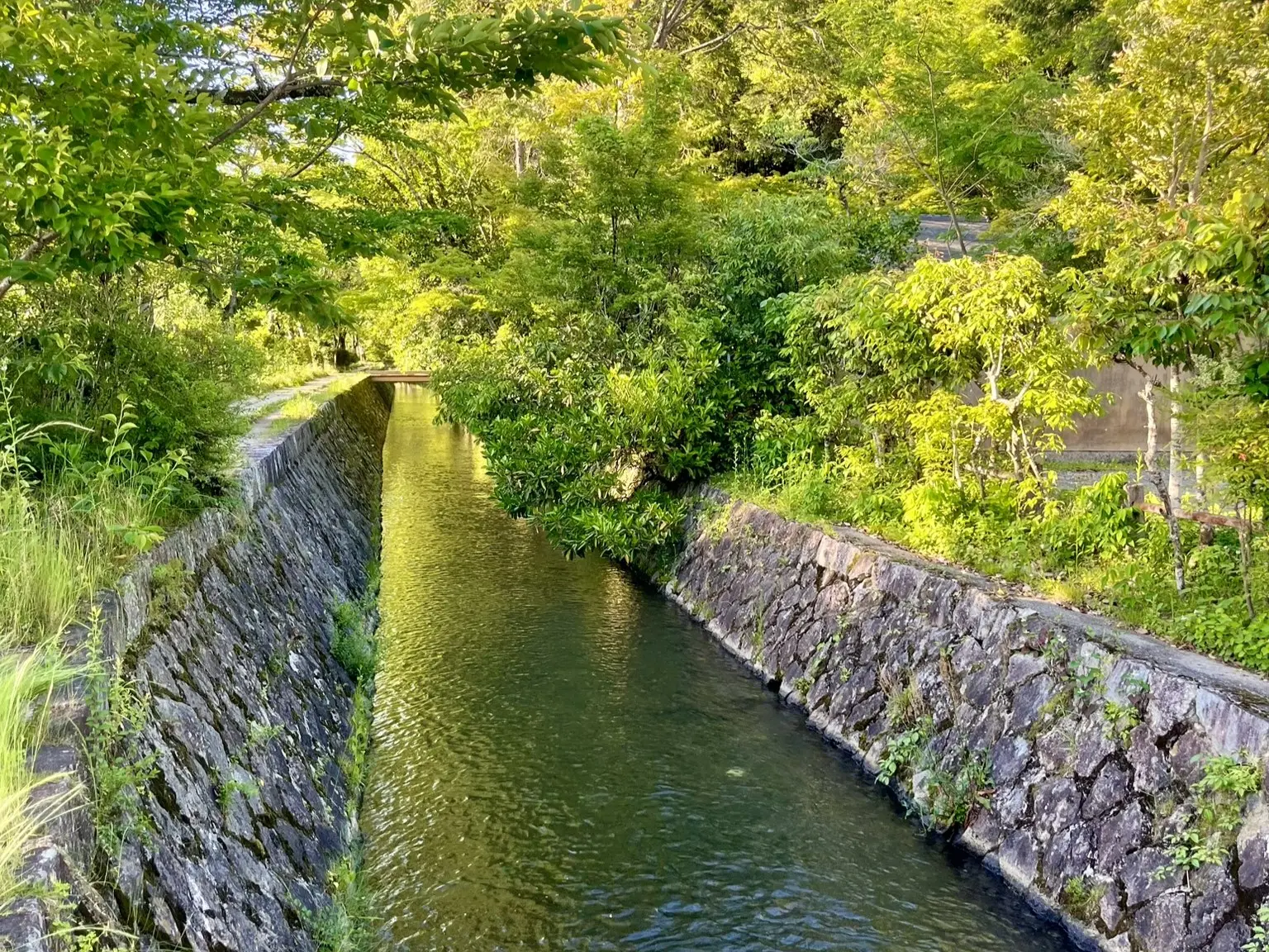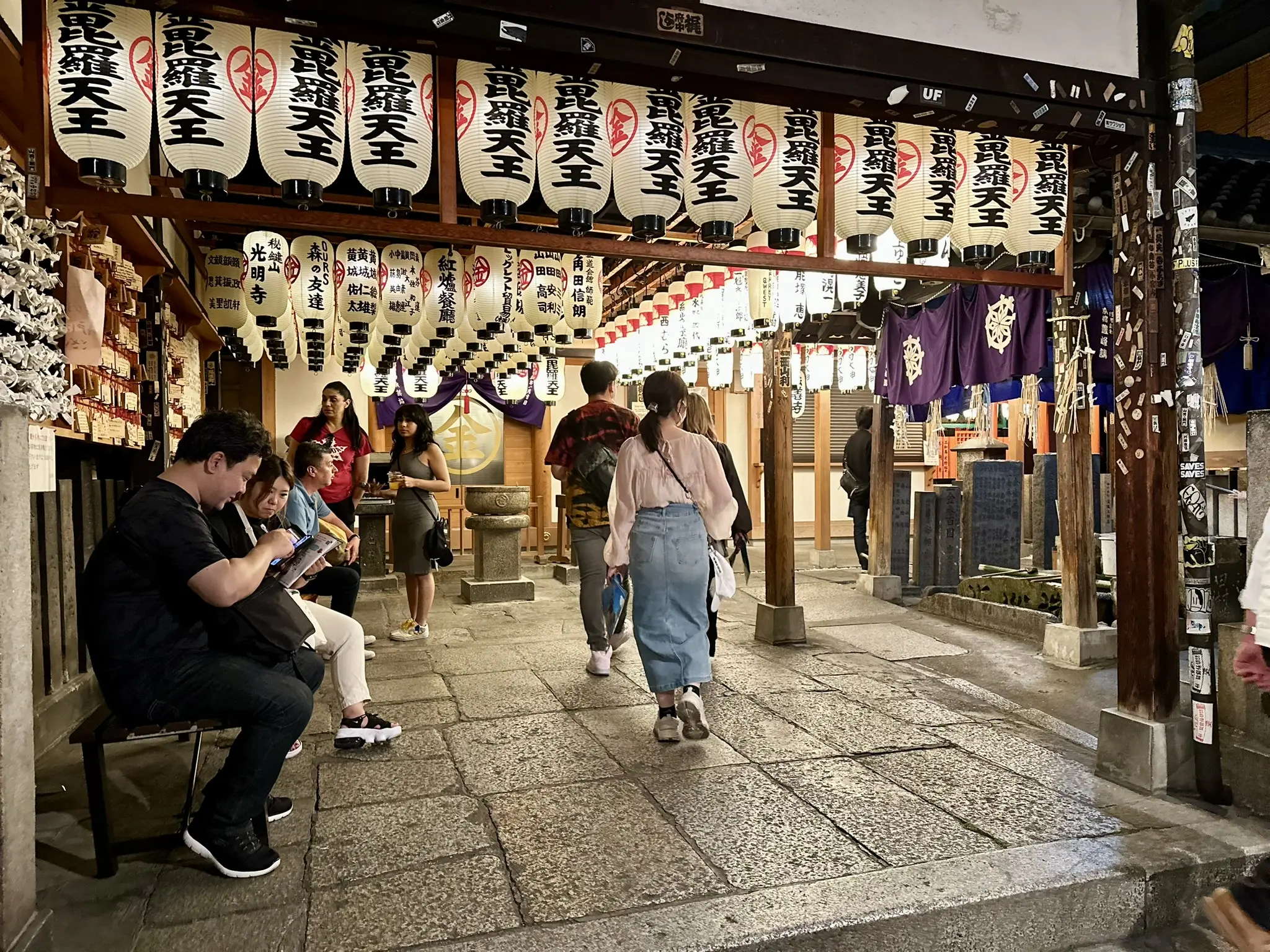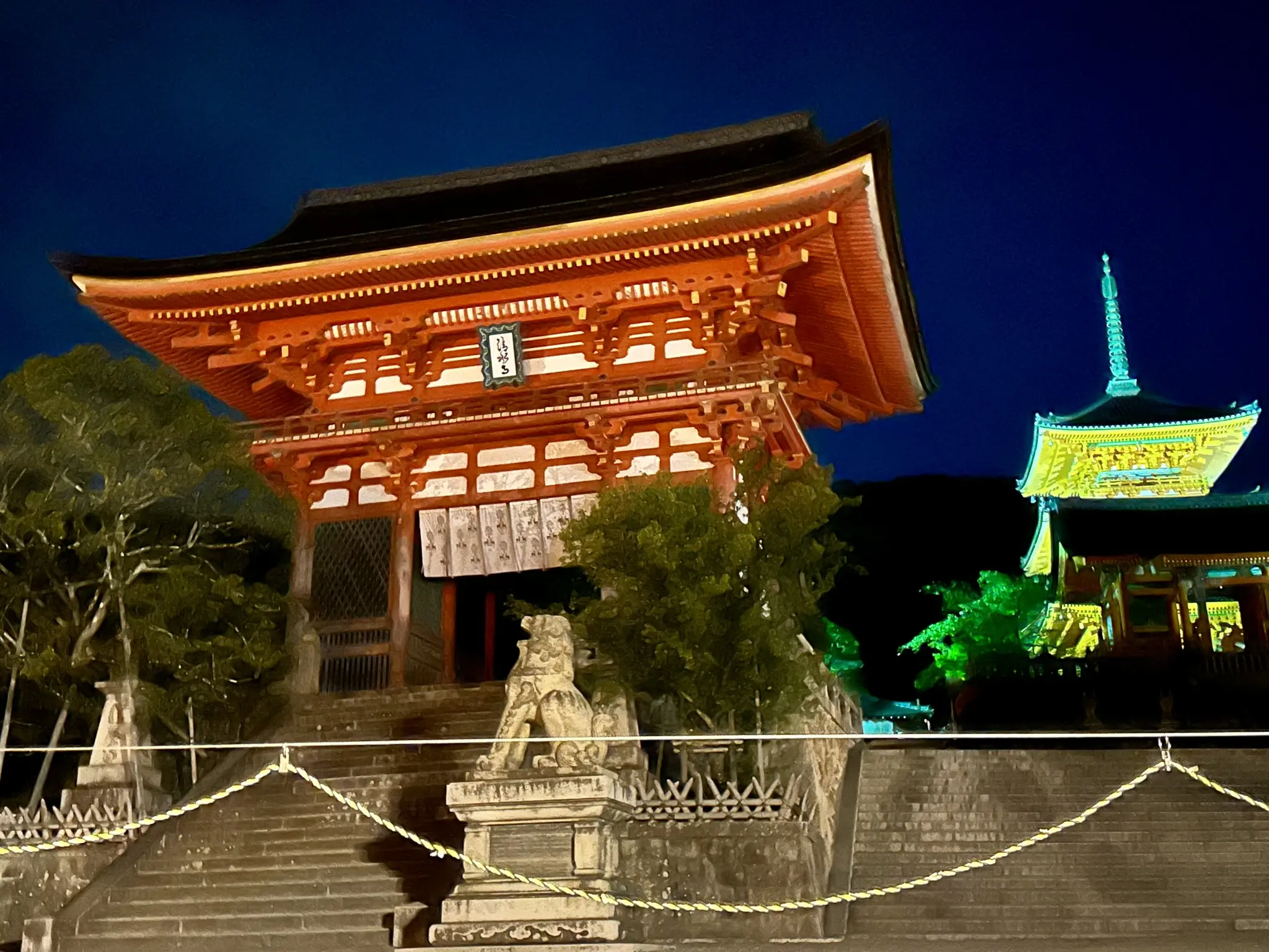 L’après-midi, on se promène le long de la rivière Sakyo, un endroit idéal pour une balade apaisante. Bien sûr, on s’arrête en chemin pour un apéro en terrasse, et on en profite pour trinquer à cette belle journée. Après l’apéro, on file vers Kiyomizu-dera, mais malheureusement le temple est fermé. Pas de souci, on l’admire éclairé, c’est tout de même magique.