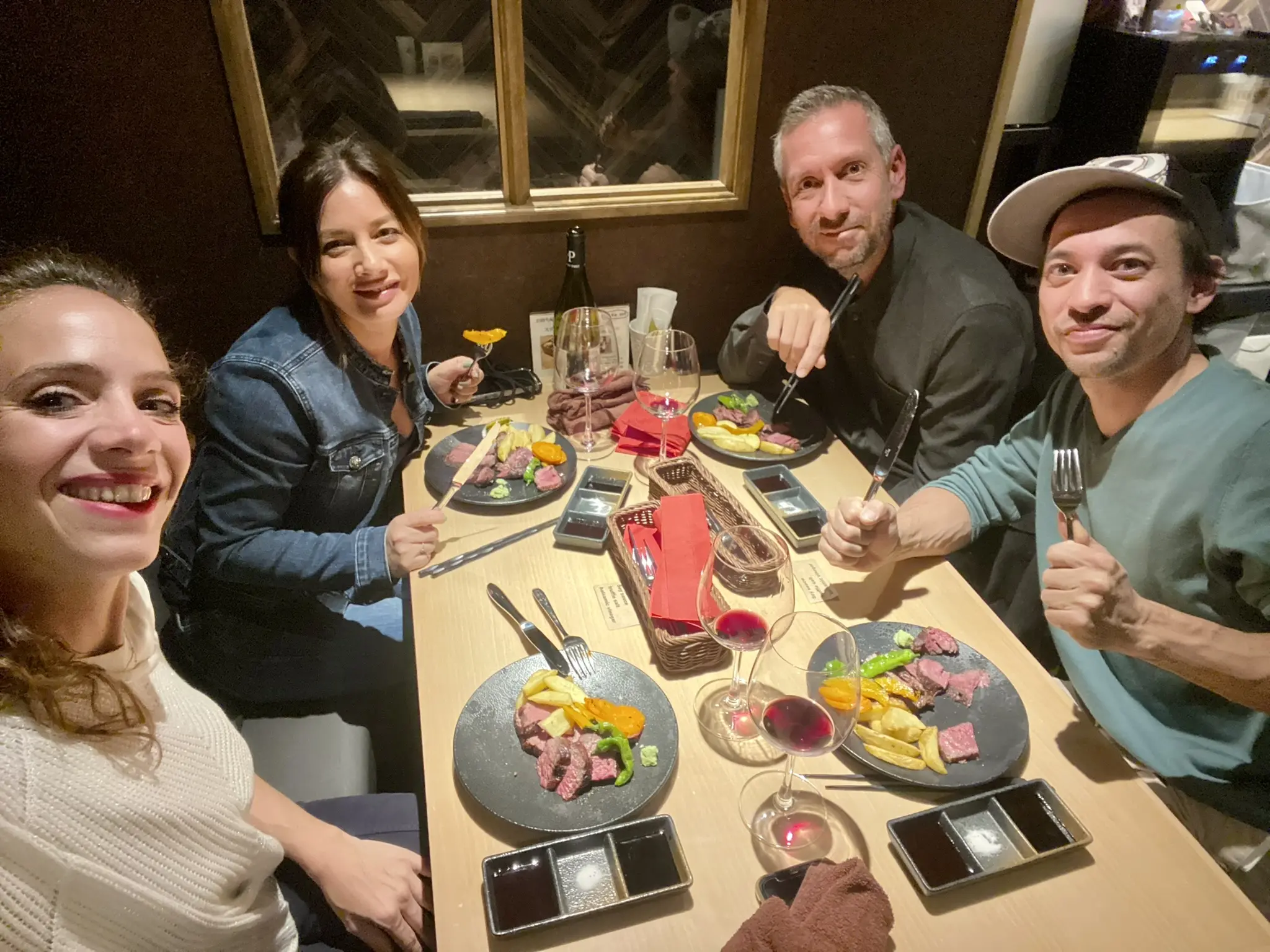 Après notre escapade à Takayama, direction Kanazawa ! Là, on retrouve Gilou, Jesse et Jun pour dîner dans un super restaurant de barbecue japonais. C’est le genre d’endroit où la convivialité est à son comble : chacun grille sa viande sur la table, et tout le monde se régale. Une excellente façon de finir la journée en beauté !