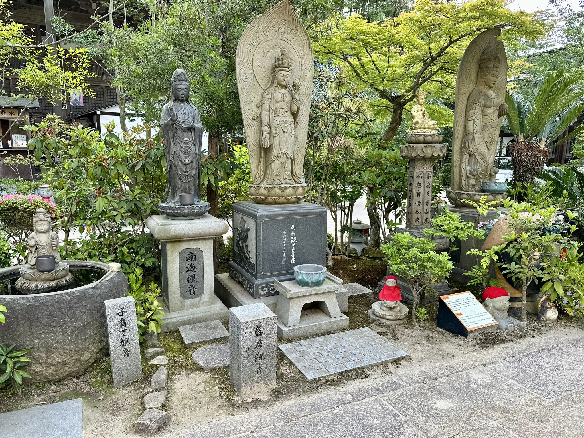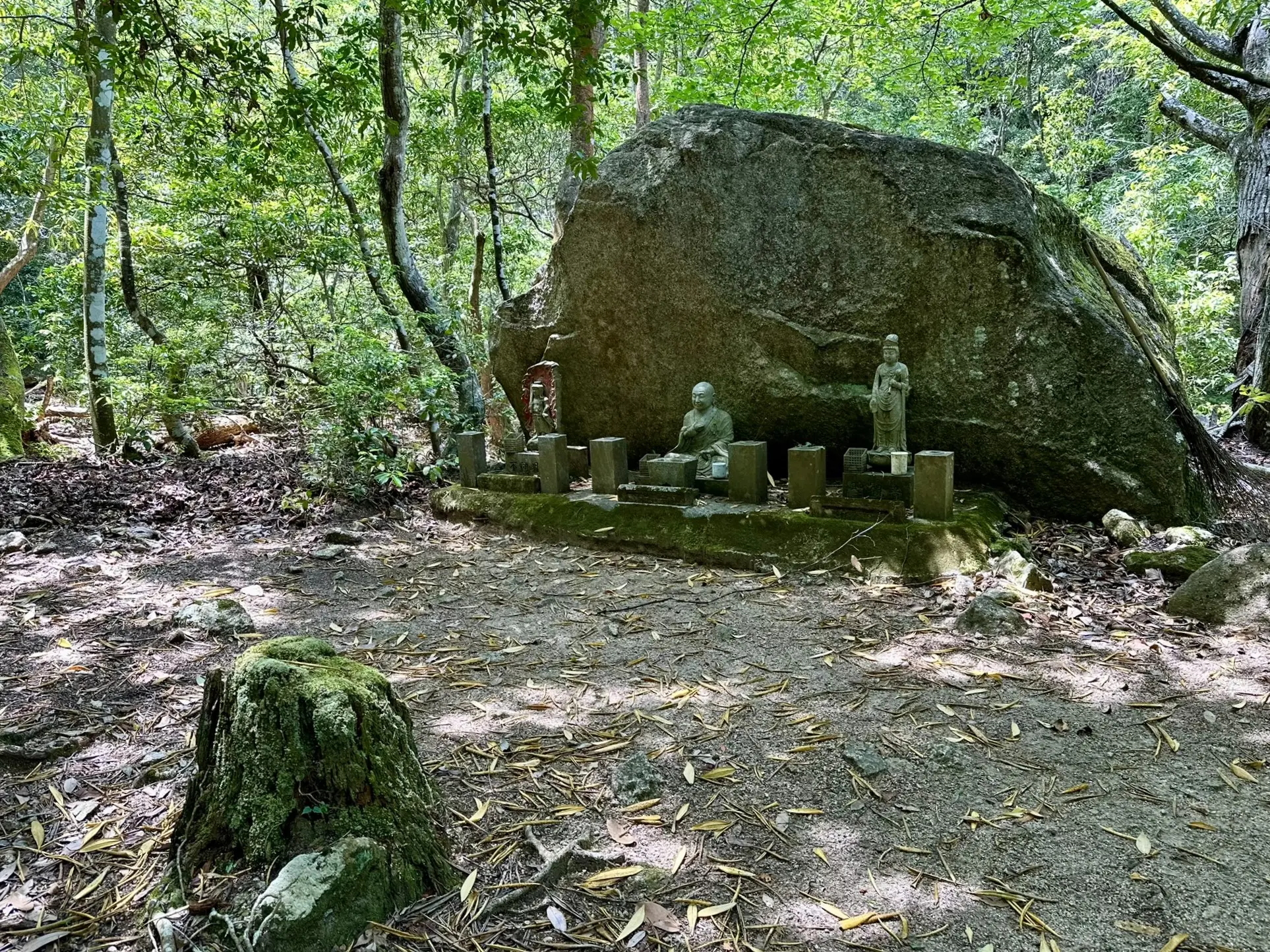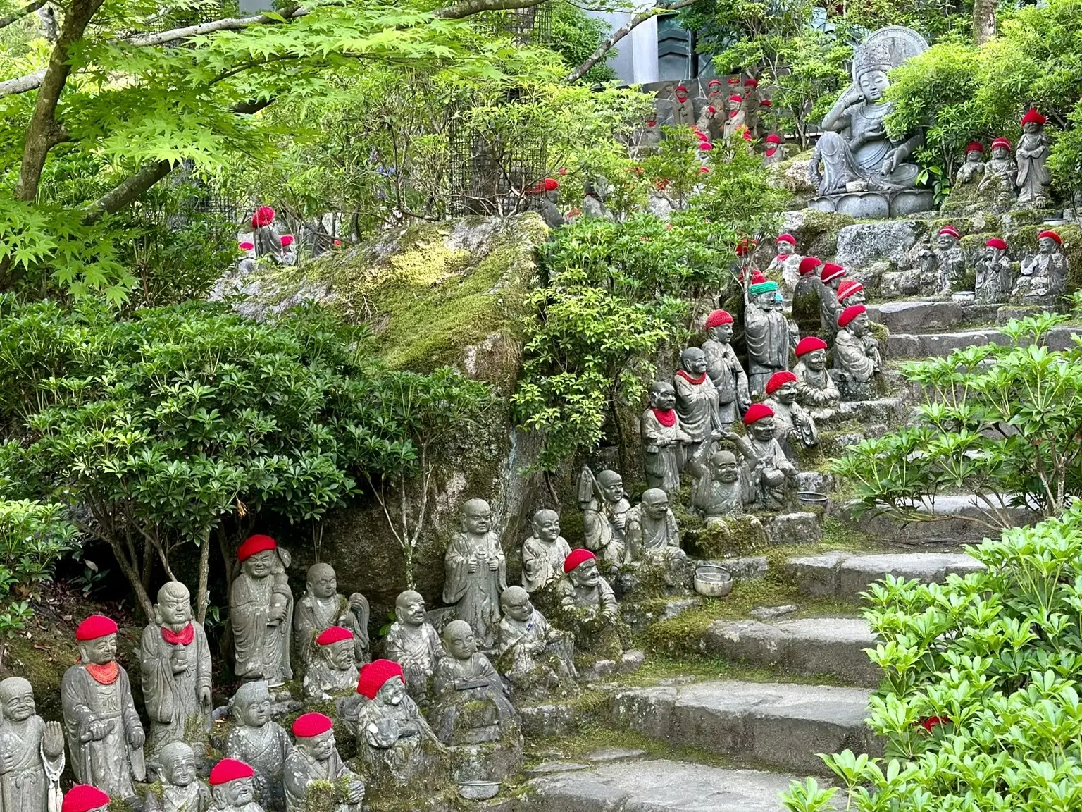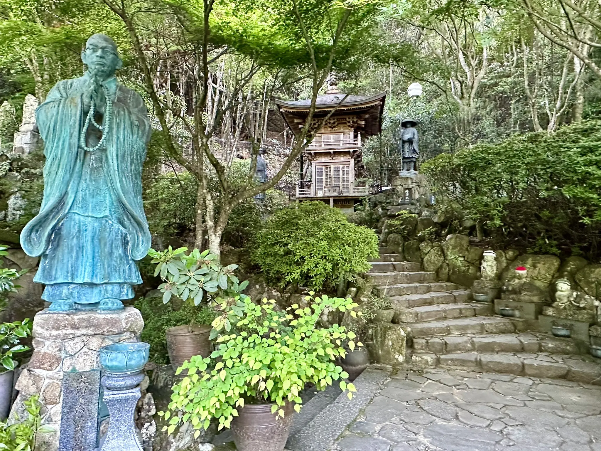 Pour le retour, on choisit le sentier Daisho-in. Un peu plus fréquenté, mais super agréable, avec un dénivelé plus doux. En chemin, on croise de nouveau des daims, un serpent et même une jolie cascade. On termine la randonnée avec la visite du temple de Daisho-In, un de mes temples préférés au Japon, avec ses statues partout. Et le mieux, c’est qu’il n’y a presque personne ici. Tranquille.