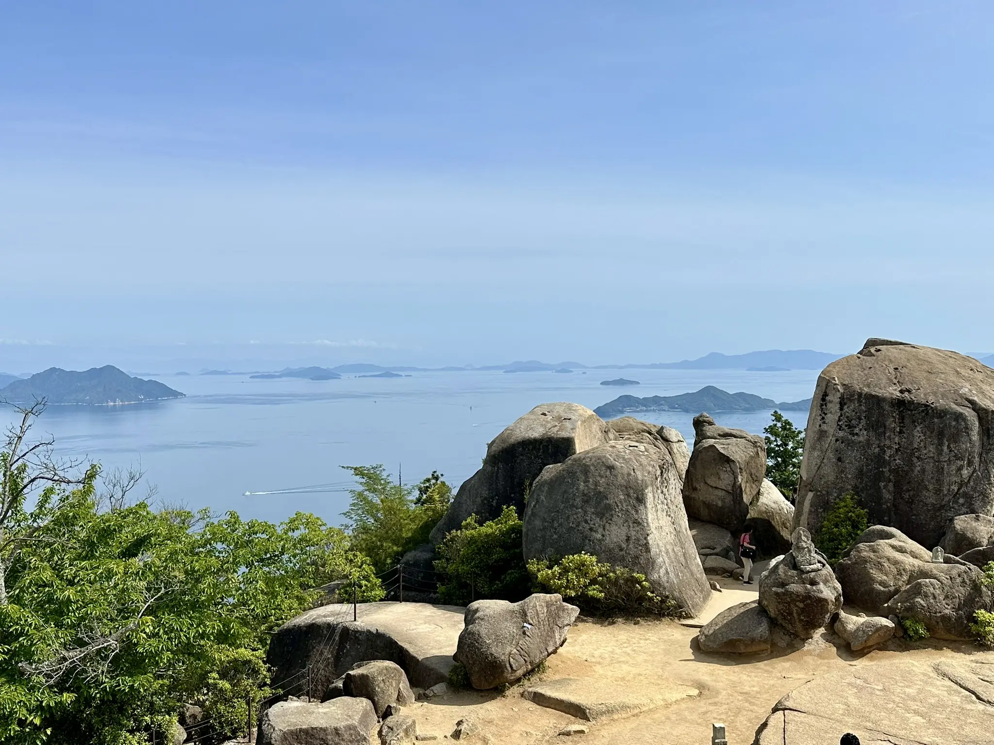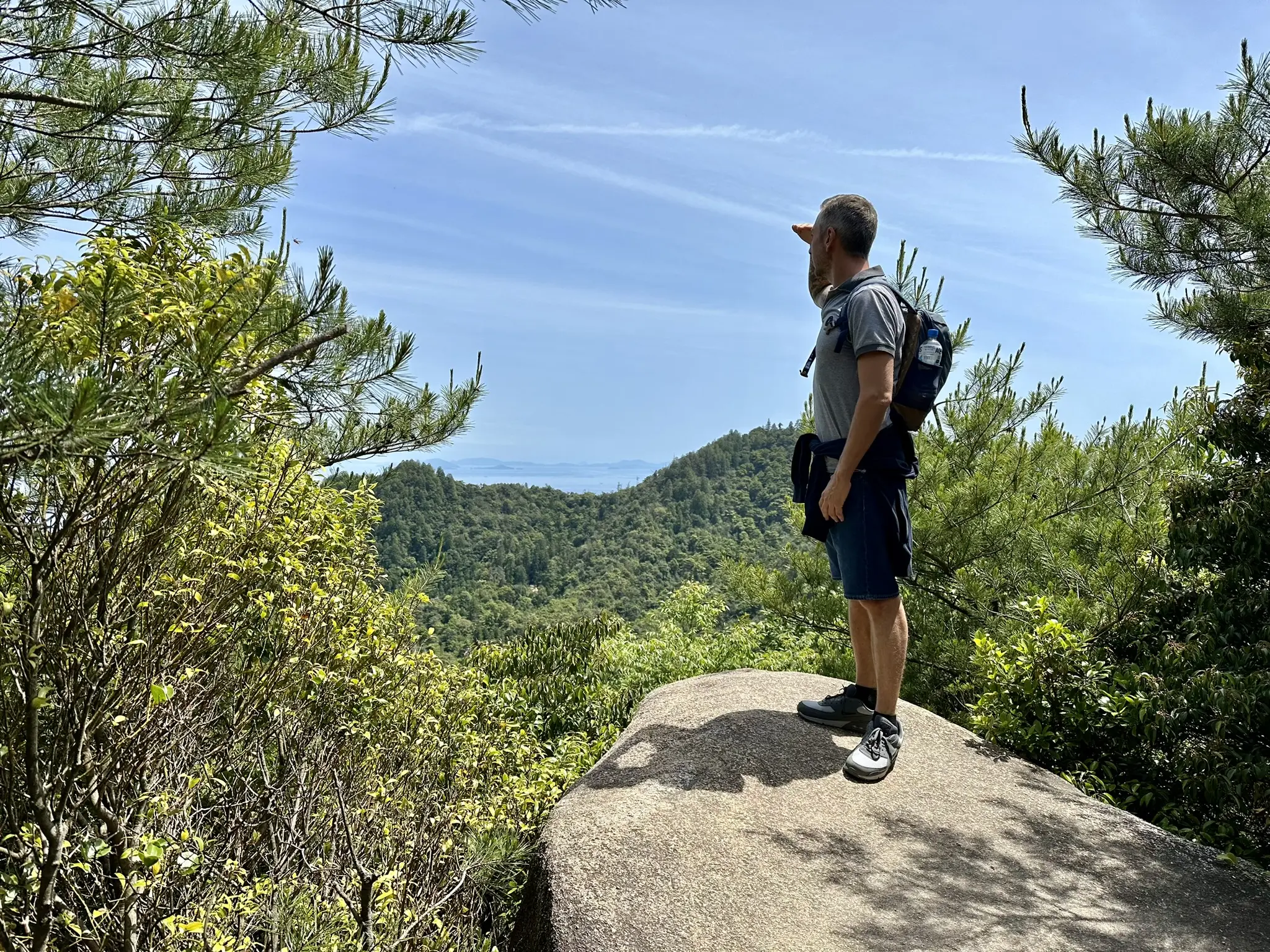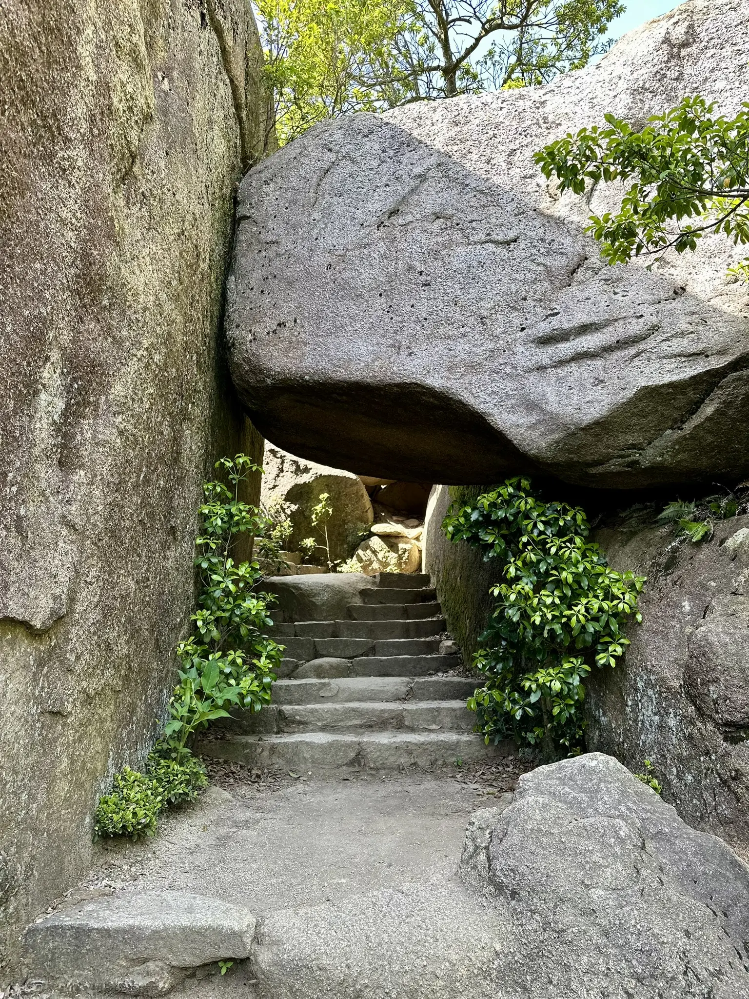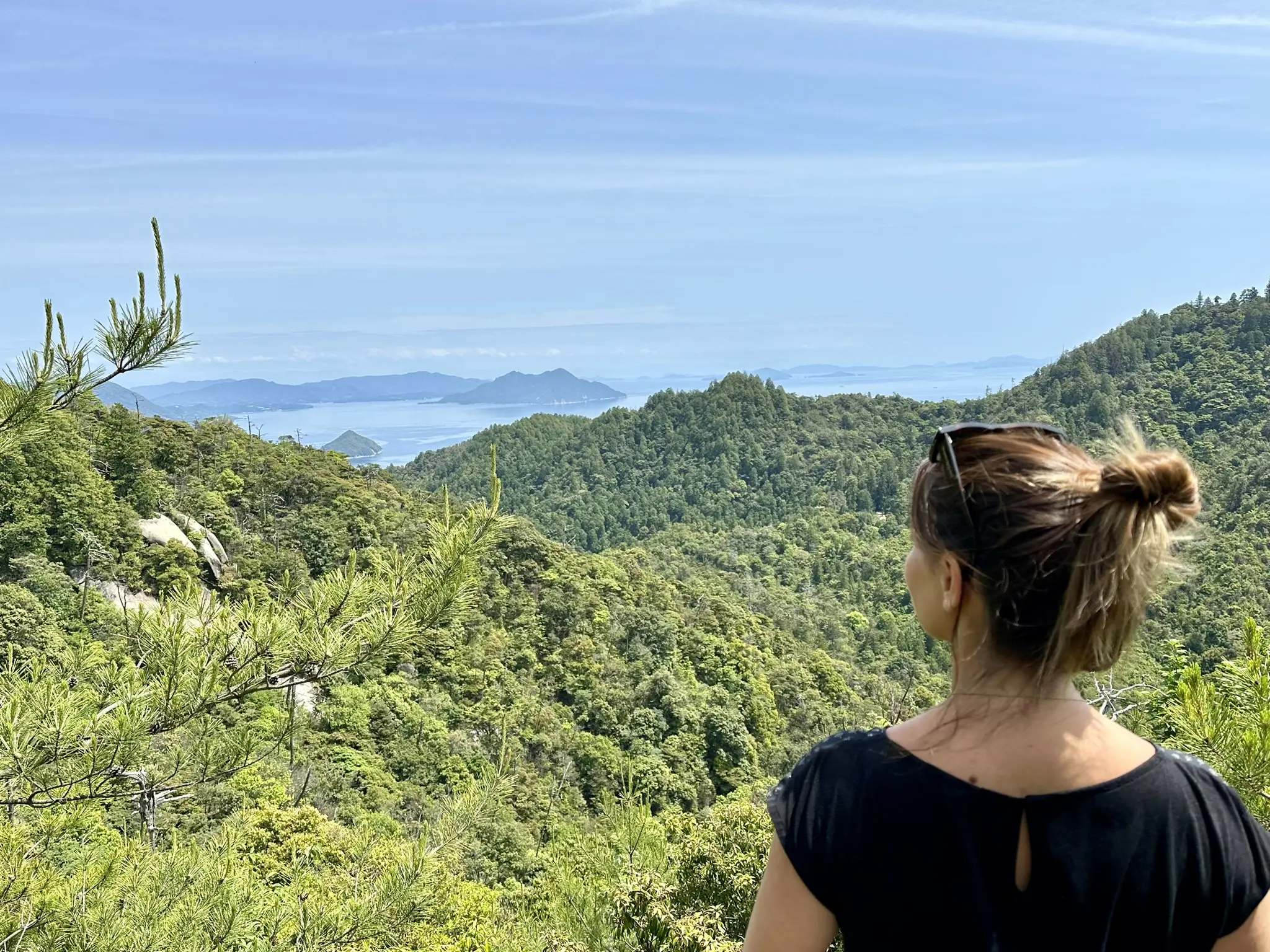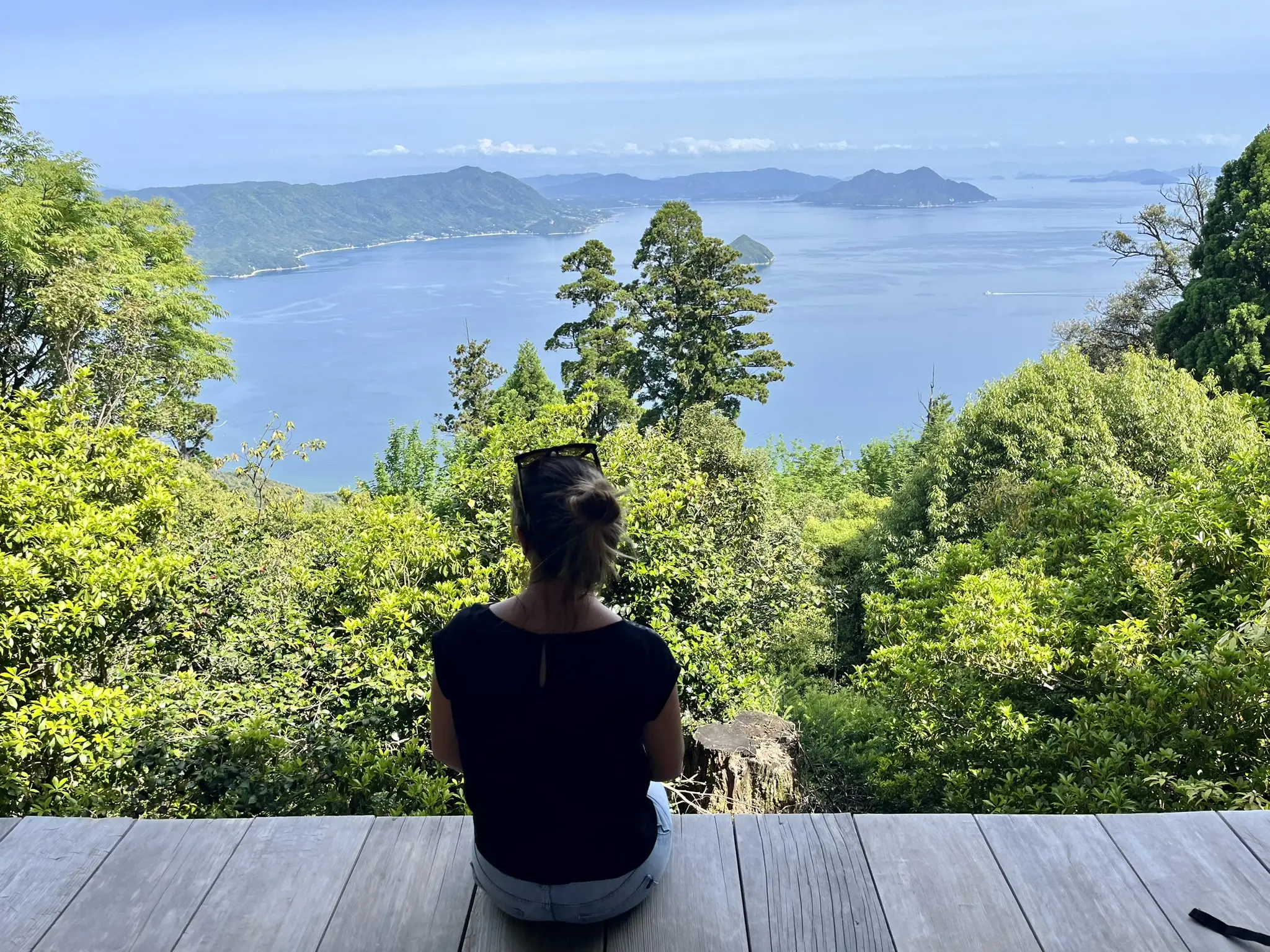 Le sentier Omoto commence au parc du même nom, où on croise une ribambelle de daims trop mignons. On longe une rivière, puis la montée commence pour de bon : une bonne heure de marche en forêt, entre pierres irrégulières et petites escales pour reprendre notre souffle. Ce qui est cool, c’est qu’on croise presque personne, donc on a le sentier pour nous tout seuls. Quand on arrive tout en haut, on est fiers comme des paons, et la vue est splendide. On s’installe tranquillou avec nos bentos pour un déjeuner bien mérité. Après cette pause, on repart et on découvre deux jolis temples avant d’arriver à l’endroit où se retrouvent tous les touristes venus en téléphérique : au sommet du mont Misen, le temple offre un panorama magnifique. Résumé : 2h (en comptant la pause déjeuner) pour parcourir 3 km sur 530 mètres de dénivelé.