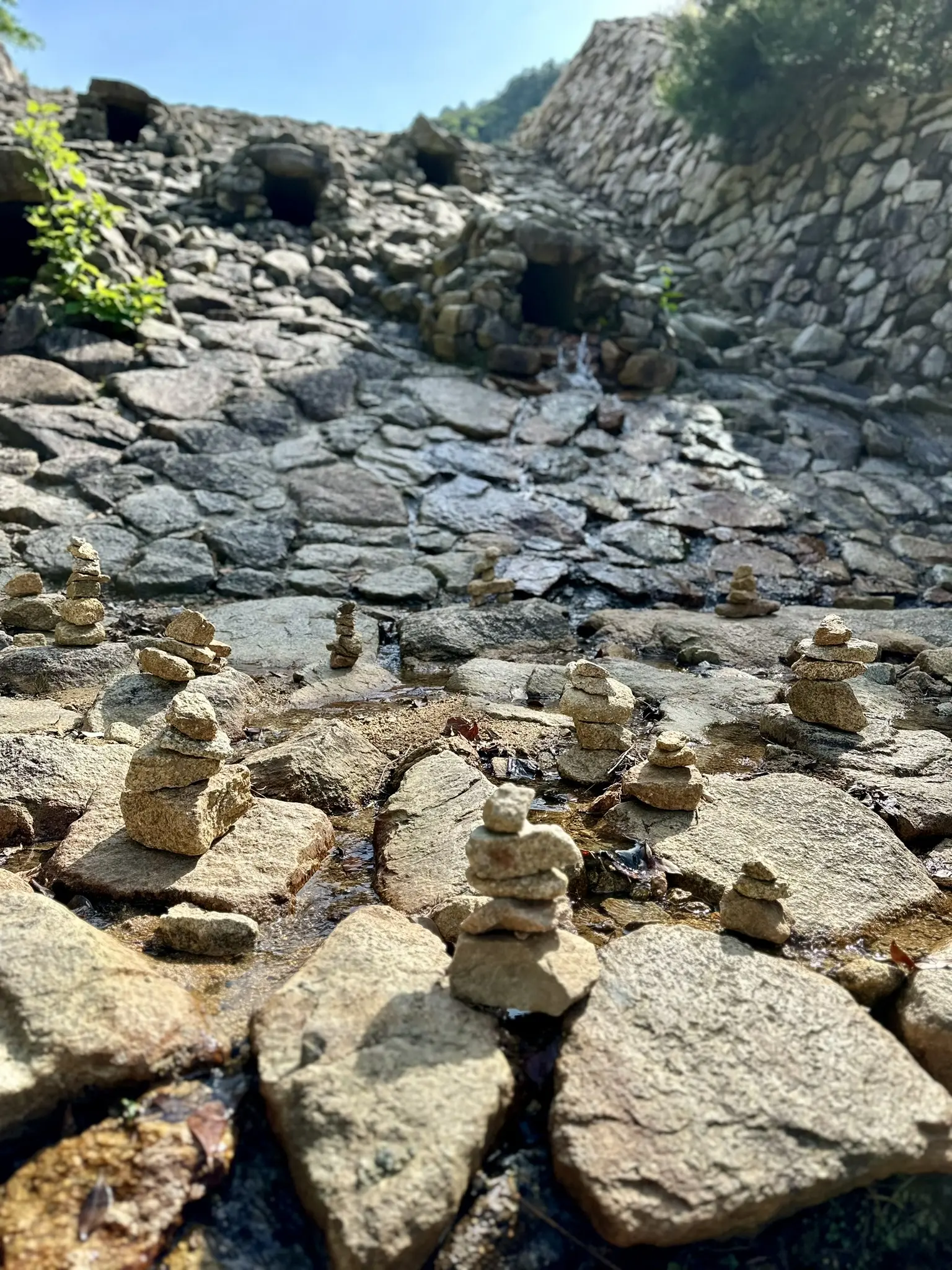 On en profite pour faire un petit détour par le tombeau familial situé à proximité de la tour. C’est la deuxième fois que je m’y rends, et c’est un moment toujours un peu particulier. Après avoir nettoyé la pierre tombale, on fait des offrandes aux ancêtres. Des fleurs fraîches, du saké, et même une cigarette pour mon papie… un petit geste que j’adore. Ma grand-mère a laissé sa trace sur mon poignet : son prénom y est gravé depuis ce voyage.