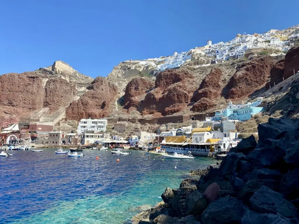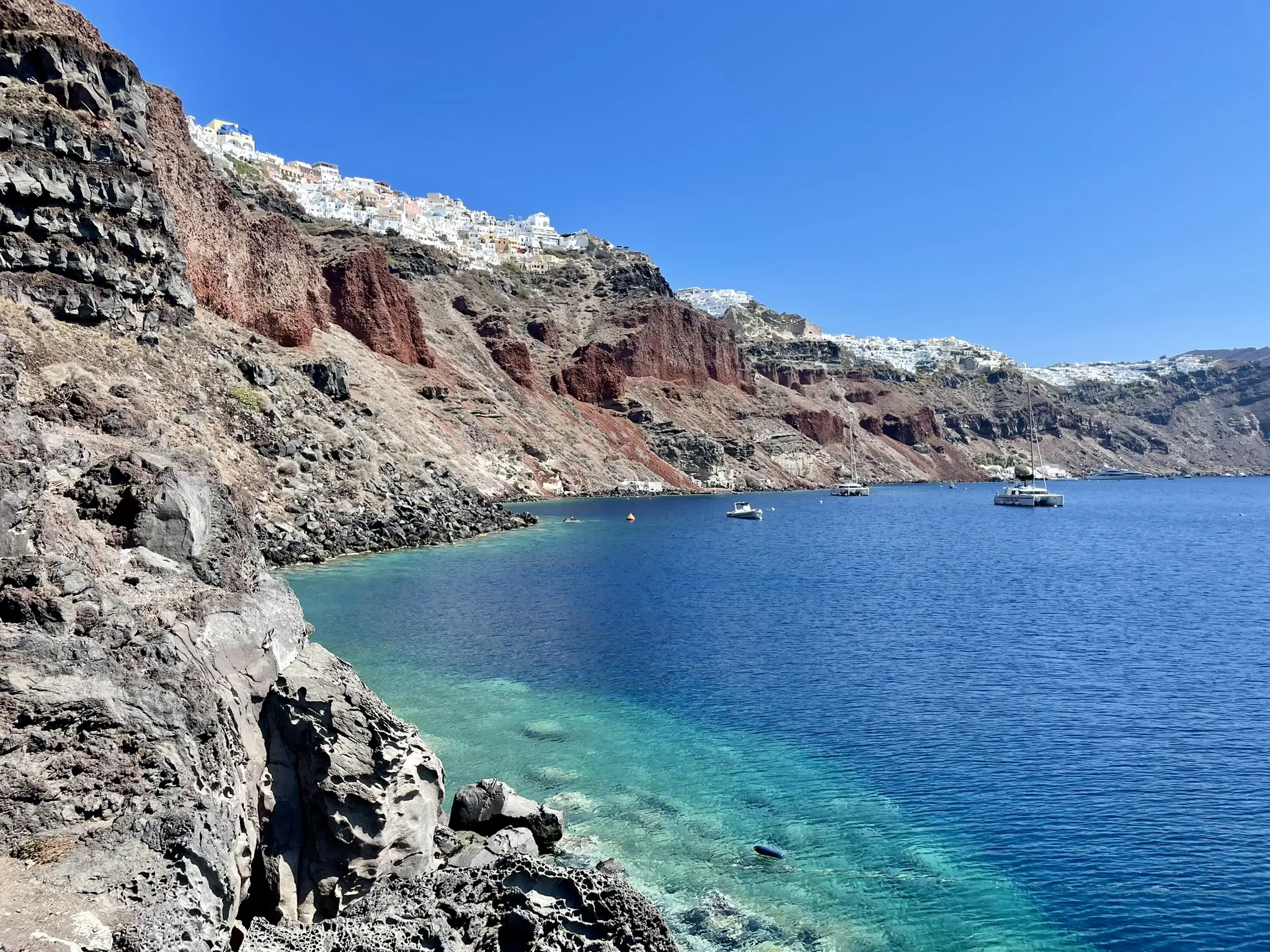 Si tu descends les marches depuis Oia, tu arrives à la baie d’Ammoudi, un petit port de pêche ultra-charmant. C’est le spot idéal pour une autre vue sur les falaises et les maisons troglodytes d’Oia, et il n’y avait pas beaucoup de monde à cet endroit mi-septembre.