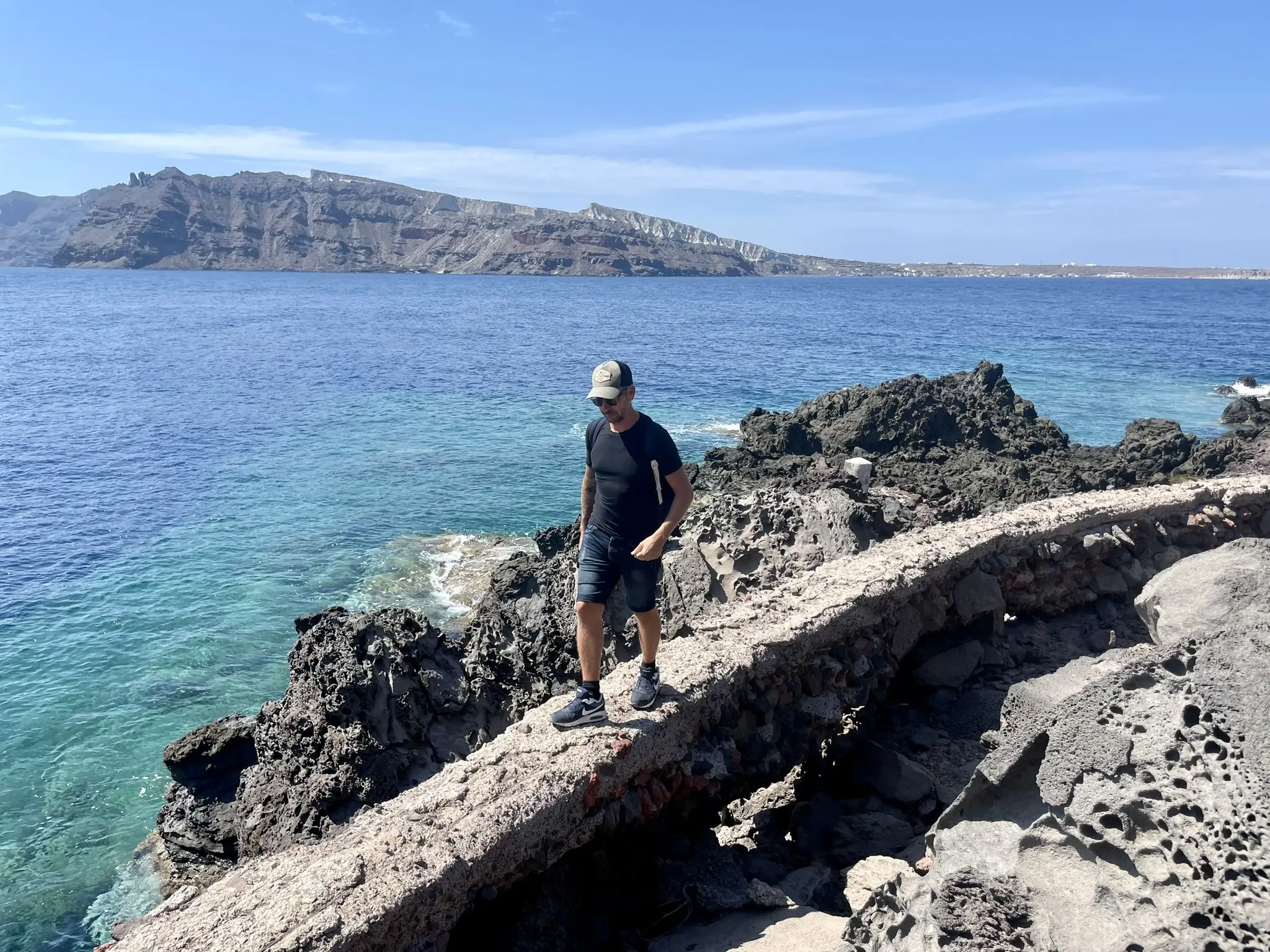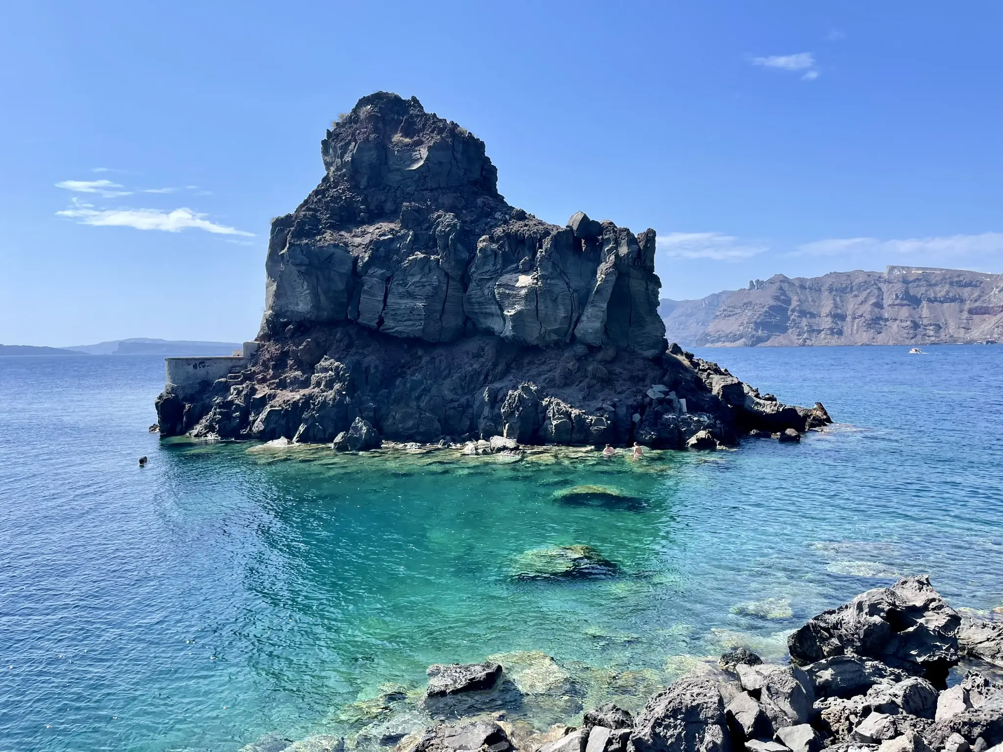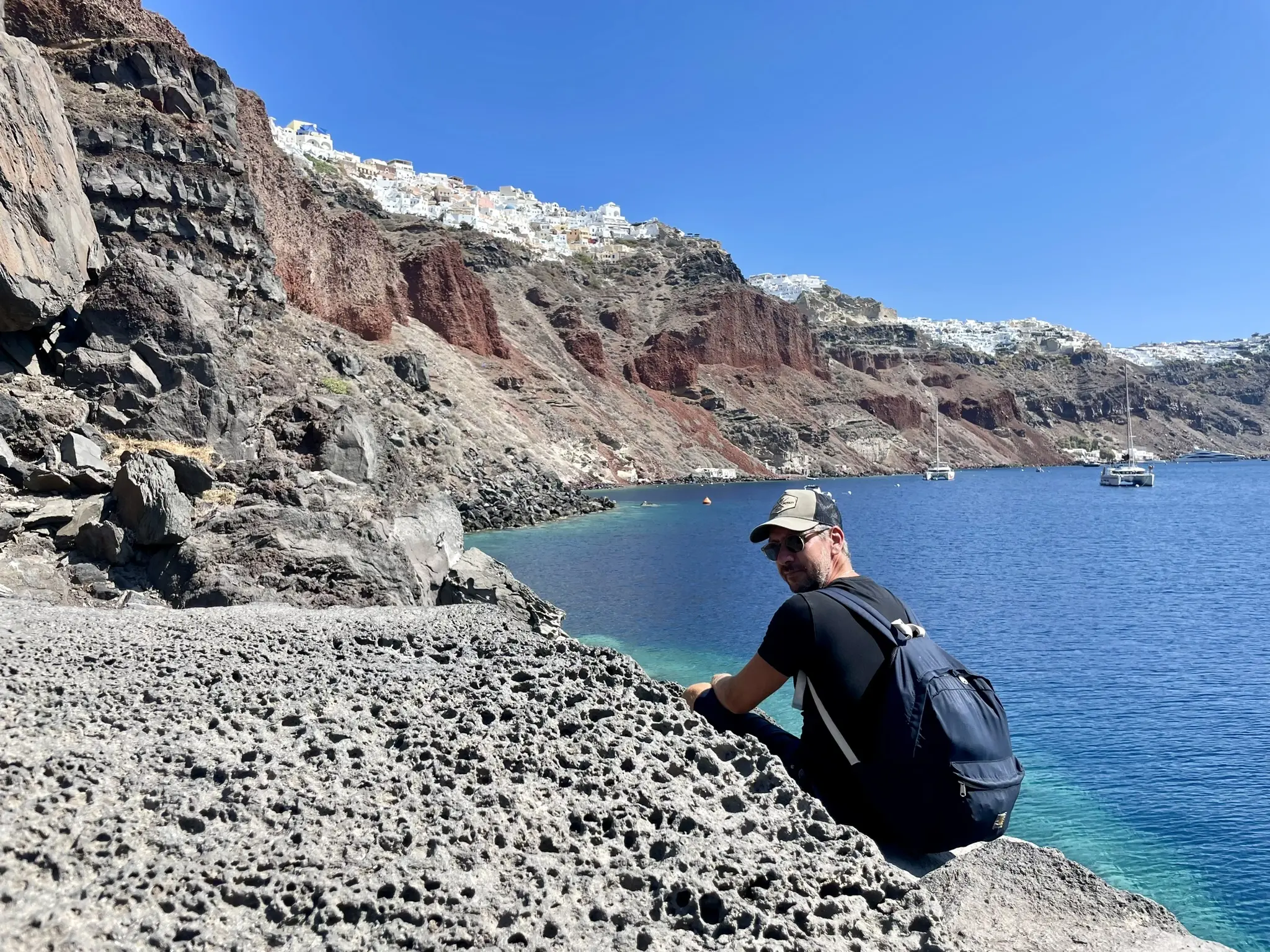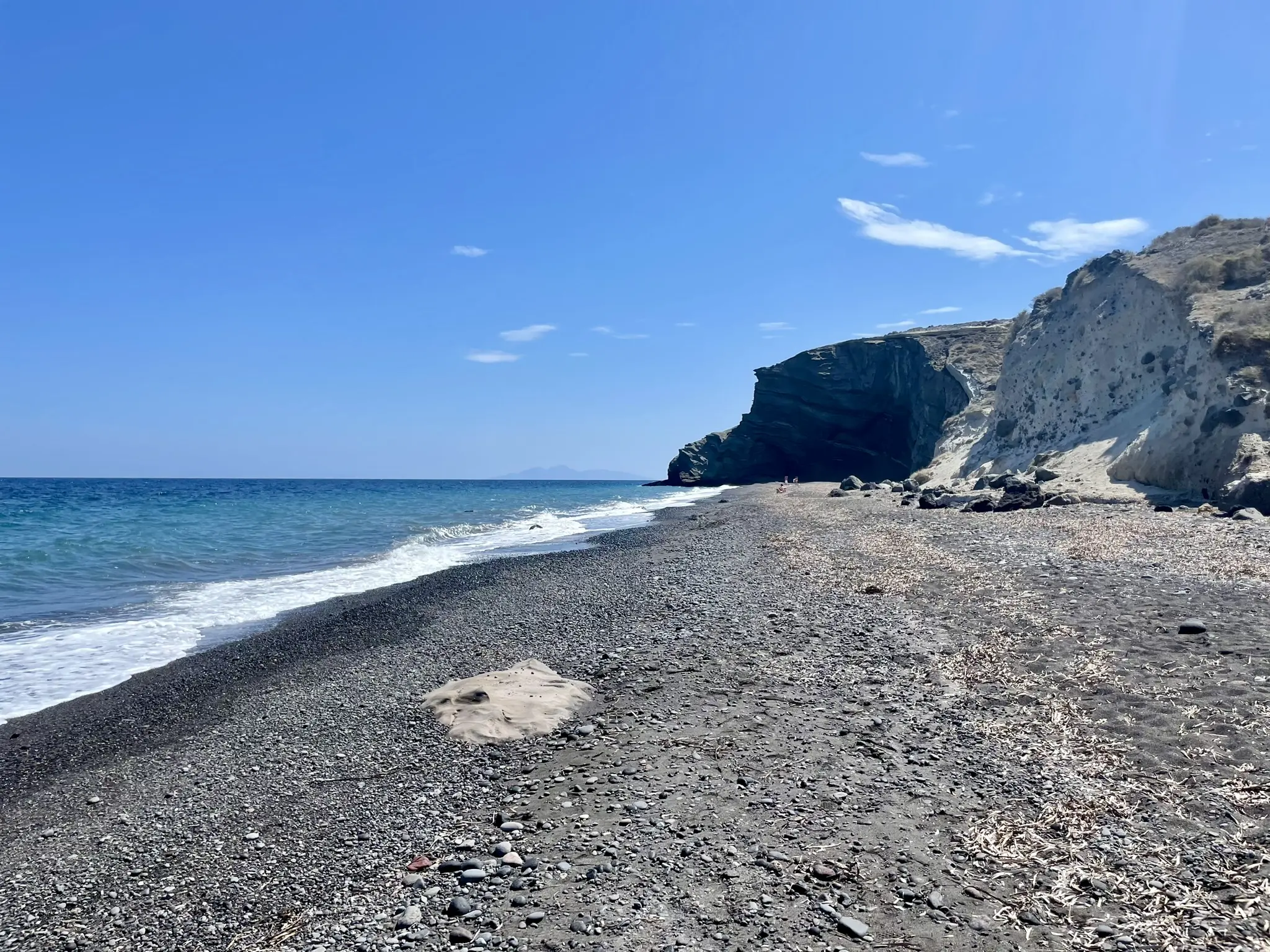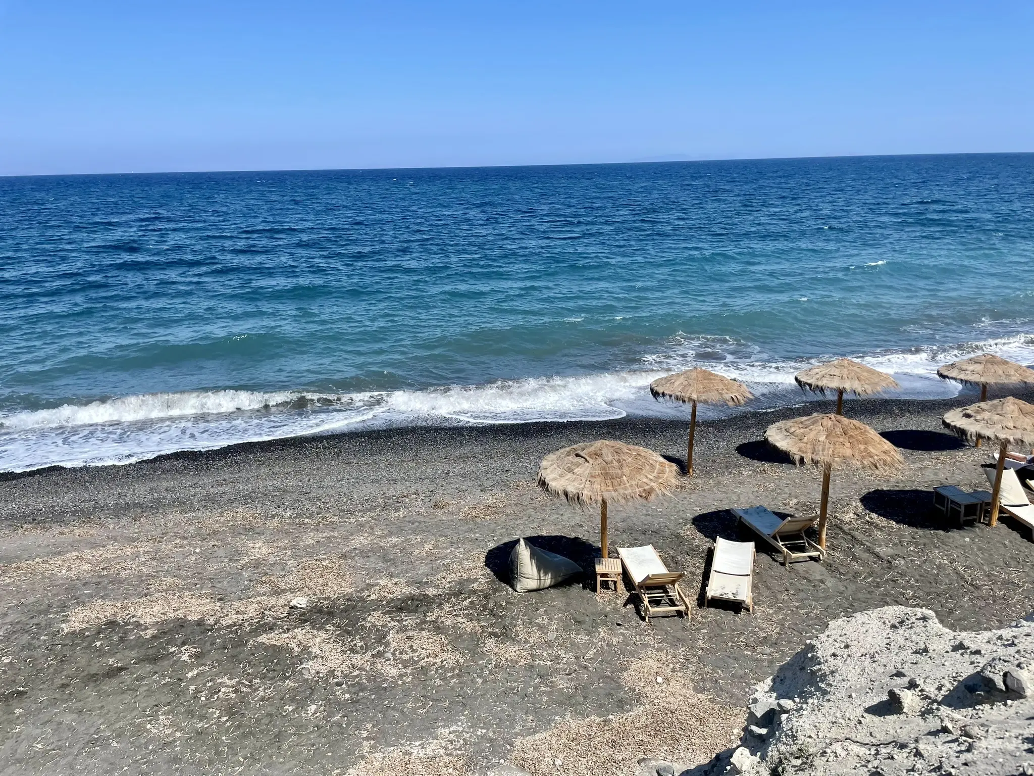 Le cap Columbo, dans le coin nord-est de l’île, c’est clairement le coin le plus isolé et tranquille de Santorin, loin de toute l’agitation touristique. Un endroit parfait pour s’échapper de la foule et profiter d’un cadre splendide. Là, sous une falaise impressionnante, on a profité de la plage quasi déserte avec son sable noir et on a même trouvé un bar avec piscine, totalement désert. C’était l’endroit parfait pour se détendre loin de tout.