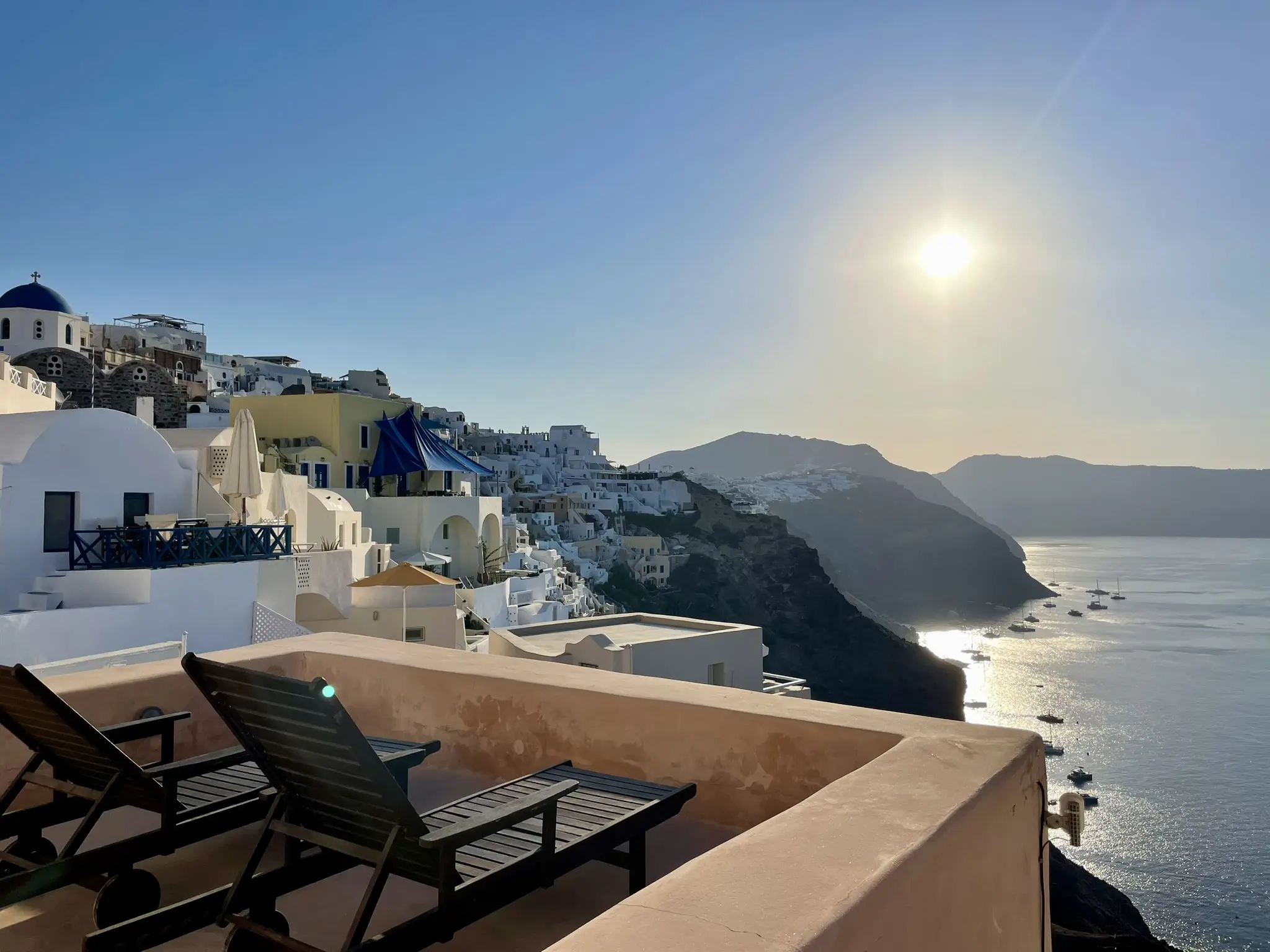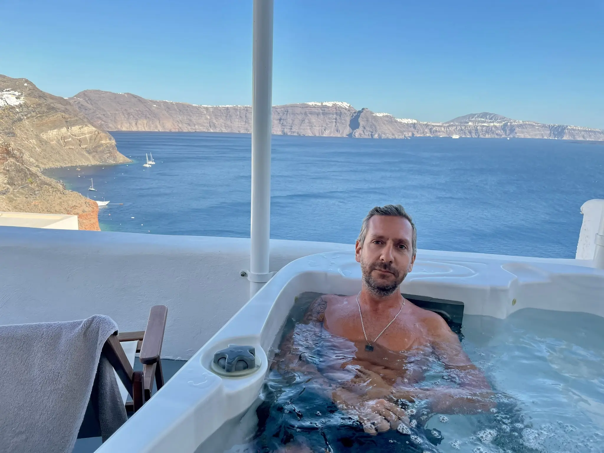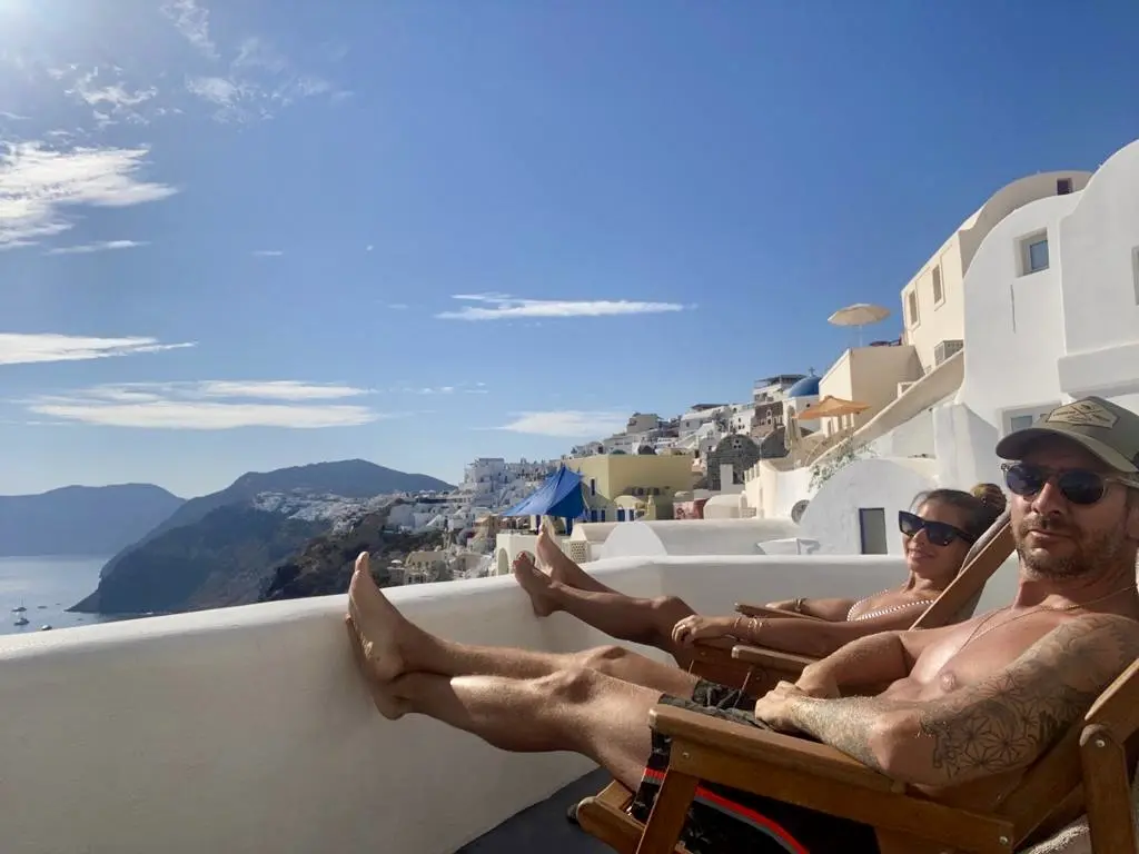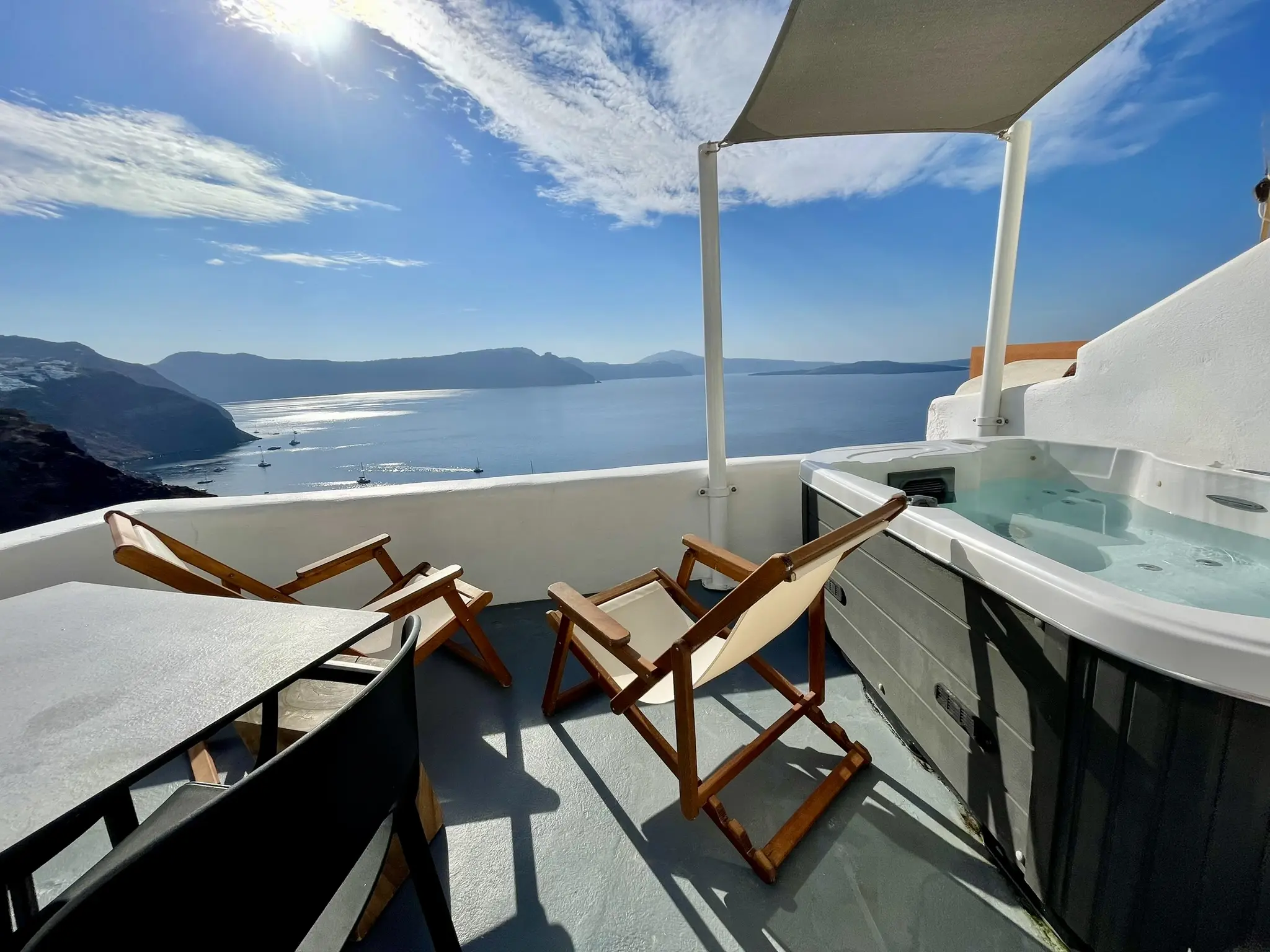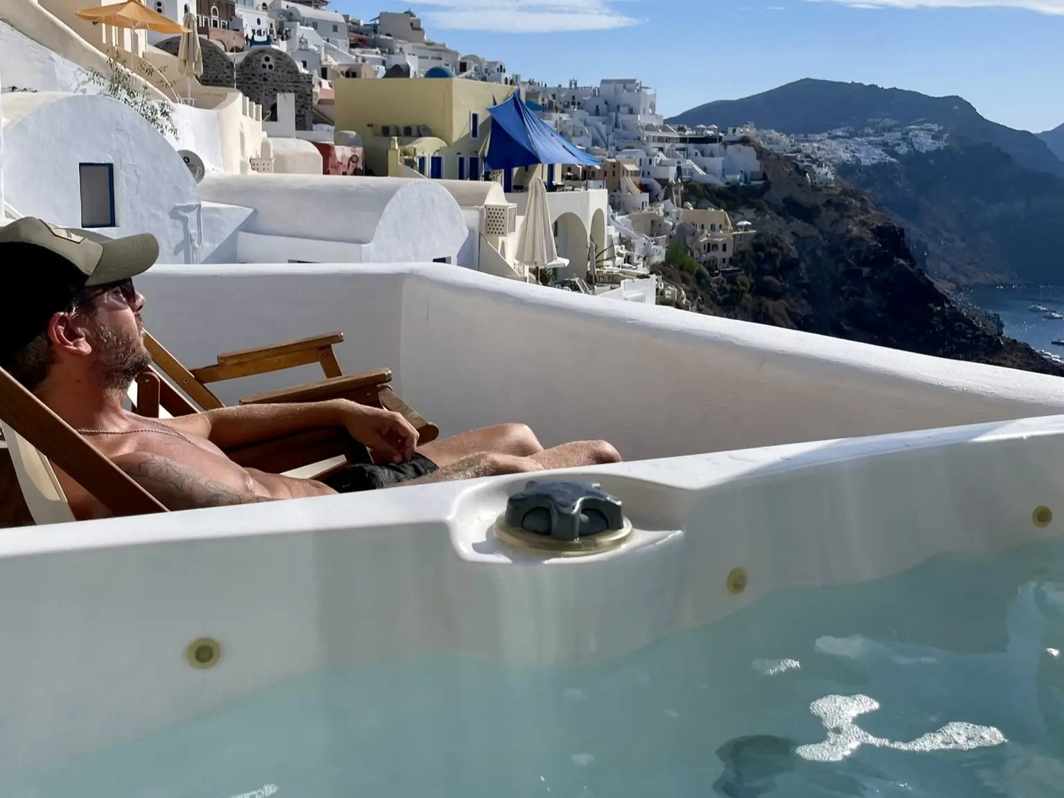 Pour notre séjour express à Santorin, on a décidé de se faire un vrai plaisir avec un logement de rêve à Oia : terrasse privée, jacuzzi et une vue qui te coupe le souffle sur la caldeira. Le top ? Quand la foule envahissait Oia, nous, on se la coulait douce dans notre petit coin de paradis. Le programme : baignade relaxante dans le jacuzzi, verre de vin blanc à la main et des panoramas de dingue. C’était l’endroit parfait pour se ressourcer et profiter de l’île en mode chill.