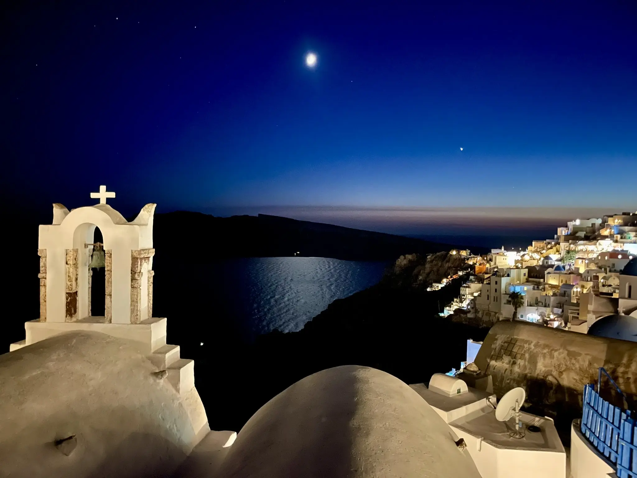Le soir, quand la foule regagne ses hôtels, il faut en profiter pour flâner dans les rues d’Oia. Les lumières qui illuminent la colline donnent à l’endroit une atmosphère magique.